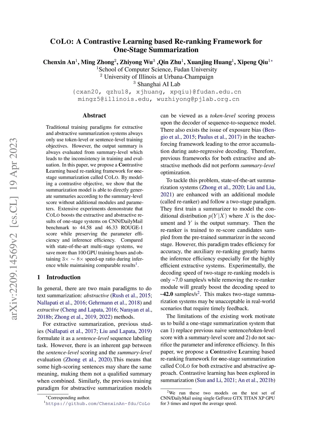 Traditional training paradigms for extractive and abstractive summarization systems always only use token-level or sentence-level training objectives. However, the output summary is always evaluated from summary-level which leads to the inconsistency in training and evaluation. In this paper, we propose a Contrastive Learning based re-ranking framework for one-stage summarization called COLO. By modeling a contrastive objective, we show that the summarization model is able to directly generate summaries according to the summary-level score without additional modules and parameters. Extensive experiments demonstrate that COLO boosts the extractive and abstractive results of one-stage systems on CNN/DailyMail benchmark to 44.58 and 46.33 ROUGE-1 score while preserving the parameter efficiency and inference efficiency. Compared with state-of-the-art multi-stage systems, we save more than 100 GPU training hours and obtaining 3~8 speed-up ratio during inference while maintaining comparable results.
