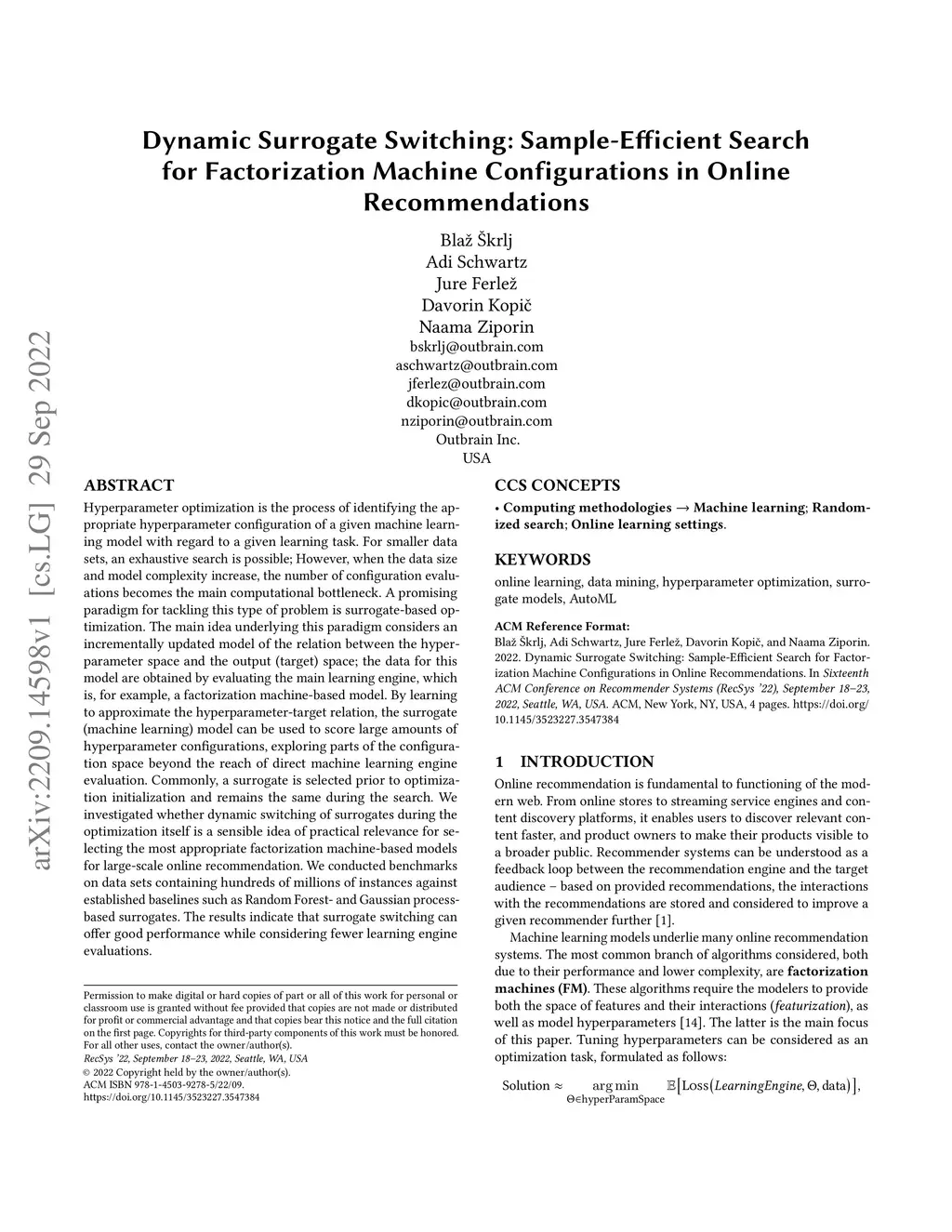 Hyperparameter optimization is the process of identifying the appropriate hyperparameter configuration of a given machine learning model with regard to a given learning task. For smaller data sets, an exhaustive search is possible; However, when the data size and model complexity increase, the number of configuration evaluations becomes the main computational bottleneck. A promising paradigm for tackling this type of problem is surrogate-based optimization. The main idea underlying this paradigm considers an incrementally updated model of the relation between the hyperparameter space and the output (target) space; the data for this model are obtained by evaluating the main learning engine, which is, for example, a factorization machine-based model. By learning to approximate the hyperparameter-target relation, the surrogate (machine learning) model can be used to score large amounts of hyperparameter configurations, exploring parts of the configuration space beyond the reach of direct machine learning engine evaluation. Commonly, a surrogate is selected prior to optimization initialization and remains the same during the search. We investigated whether dynamic switching of surrogates during the optimization itself is a sensible idea of practical relevance for selecting the most appropriate factorization machine-based models for large-scale online recommendation. We conducted benchmarks on data sets containing hundreds of millions of instances against established baselines such as Random Forest- and Gaussian process-based surrogates. The results indicate that surrogate switching can offer good performance while considering fewer learning engine evaluations.