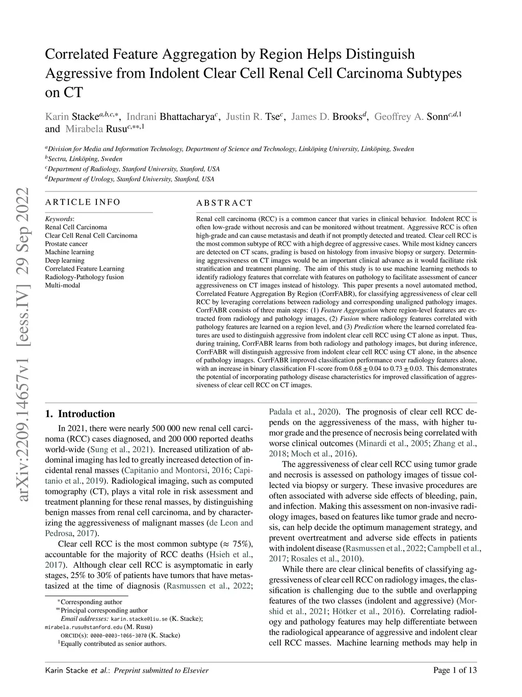 Renal cell carcinoma (RCC) is a common cancer that varies in clinical behavior. Indolent RCC is often low-grade without necrosis and can be monitored without treatment. Aggressive RCC is often high-grade and can cause metastasis and death if not promptly detected and treated. While most kidney cancers are detected on CT scans, grading is based on histology from invasive biopsy or surgery. Determining aggressiveness on CT images is clinically important as it facilitates risk stratification and treatment planning. This study aims to use machine learning methods to identify radiology features that correlate with features on pathology to facilitate assessment of cancer aggressiveness on CT images instead of histology. This paper presents a novel automated method, Correlated Feature Aggregation By Region (CorrFABR), for classifying aggressiveness of clear cell RCC by leveraging correlations between radiology and corresponding unaligned pathology images. CorrFABR consists of three main steps: (1) Feature Aggregation where region-level features are extracted from radiology and pathology images, (2) Fusion where radiology features correlated with pathology features are learned on a region level, and (3) Prediction where the learned correlated features are used to distinguish aggressive from indolent clear cell RCC using CT alone as input. Thus, during training, CorrFABR learns from both radiology and pathology images, but during inference, CorrFABR will distinguish aggressive from indolent clear cell RCC using CT alone, in the absence of pathology images. CorrFABR improved classification performance over radiology features alone, with an increase in binary classification F1-score from 0.68 (0.04) to 0.73 (0.03). This demonstrates the potential of incorporating pathology disease characteristics for improved classification of aggressiveness of clear cell RCC on CT images.