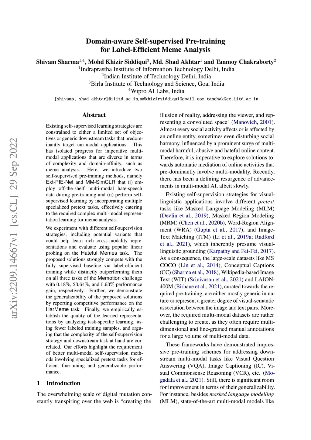 Existing self-supervised learning strategies are constrained to either a limited set of objectives or generic downstream tasks that predominantly target uni-modal applications. This has isolated progress for imperative multi-modal applications that are diverse in terms of complexity and domain-affinity, such as meme analysis. Here, we introduce two self-supervised pre-training methods, namely Ext-PIE-Net and MM-SimCLR that (i) employ off-the-shelf multi-modal hate-speech data during pre-training and (ii) perform self-supervised learning by incorporating multiple specialized pretext tasks, effectively catering to the required complex multi-modal representation learning for meme analysis. We experiment with different self-supervision strategies, including potential variants that could help learn rich cross-modality representations and evaluate using popular linear probing on the Hateful Memes task. The proposed solutions strongly compete with the fully supervised baseline via label-efficient training while distinctly outperforming them on all three tasks of the Memotion challenge with 0.18%, 23.64%, and 0.93% performance gain, respectively. Further, we demonstrate the generalizability of the proposed solutions by reporting competitive performance on the HarMeme task. Finally, we empirically establish the quality of the learned representations by analyzing task-specific learning, using fewer labeled training samples, and arguing that the complexity of the self-supervision strategy and downstream task at hand are correlated. Our efforts highlight the requirement of better multi-modal self-supervision methods involving specialized pretext tasks for efficient fine-tuning and generalizable performance.