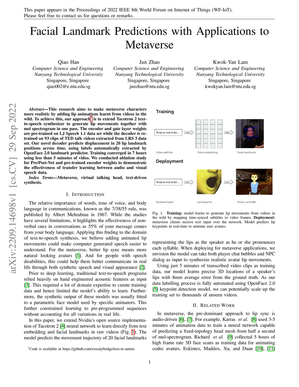 This research aims to make metaverse characters more realistic by adding lip animations learnt from videos in the wild. To achieve this, our approach is to extend Tacotron 2 text-to-speech synthesizer to generate lip movements together with mel spectrogram in one pass. The encoder and gate layer weights are pre-trained on LJ Speech 1.1 data set while the decoder is retrained on 93 clips of TED talk videos extracted from LRS 3 data set. Our novel decoder predicts displacement in 20 lip landmark positions across time, using labels automatically extracted by OpenFace 2.0 landmark predictor. Training converged in 7 hours using less than 5 minutes of video. We conducted ablation study for Pre/Post-Net and pre-trained encoder weights to demonstrate the effectiveness of transfer learning between audio and visual speech data.