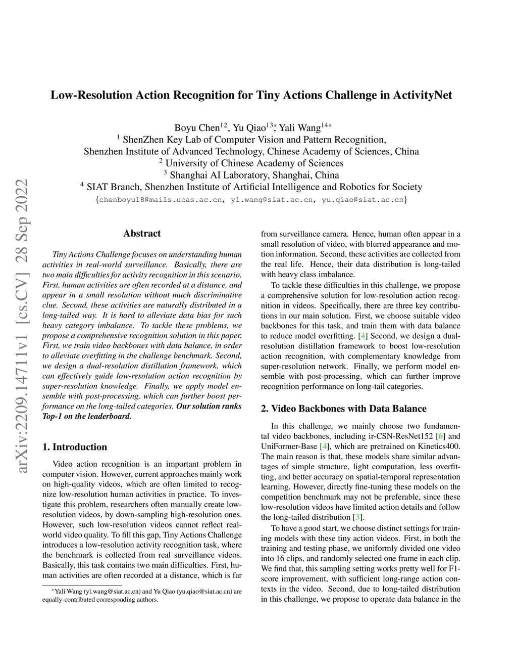 Tiny Actions Challenge focuses on understanding human activities in real-world surveillance. Basically, there are two main difficulties for activity recognition in this scenario. First, human activities are often recorded at a distance, and appear in a small resolution without much discriminative clue. Second, these activities are naturally distributed in a long-tailed way. It is hard to alleviate data bias for such heavy category imbalance. To tackle these problems, we propose a comprehensive recognition solution in this paper. First, we train video backbones with data balance, in order to alleviate overfitting in the challenge benchmark. Second, we design a dual-resolution distillation framework, which can effectively guide low-resolution action recognition by super-resolution knowledge. Finally, we apply model en-semble with post-processing, which can further boost per-formance on the long-tailed categories. Our solution ranks Top-1 on the leaderboard.