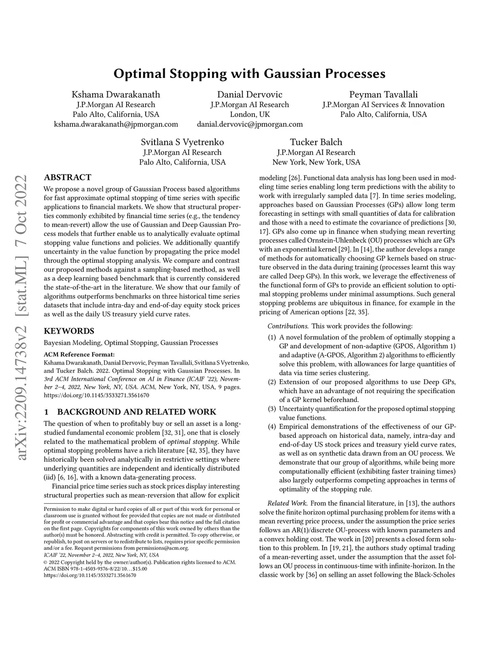 We propose a novel group of Gaussian Process based algorithms for fast approximate optimal stopping of time series with specific applications to financial markets. We show that structural properties commonly exhibited by financial time series (e.g., the tendency to mean-revert) allow the use of Gaussian and Deep Gaussian Process models that further enable us to analytically evaluate optimal stopping value functions and policies. We additionally quantify uncertainty in the value function by propagating the price model through the optimal stopping analysis. We compare and contrast our proposed methods against a sampling-based method, as well as a deep learning based benchmark that is currently considered the state-of-the-art in the literature. We show that our family of algorithms outperforms benchmarks on three historical time series datasets that include intra-day and end-of-day equity stock prices as well as the daily US treasury yield curve rates.