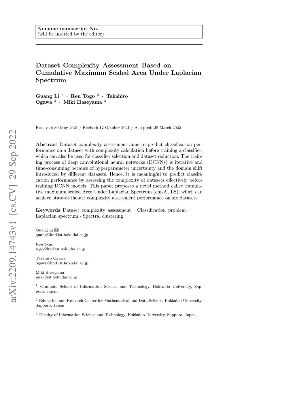 Dataset complexity assessment aims to predict classification performance on a dataset with complexity calculation before training a classifier, which can also be used for classifier selection and dataset reduction. The training process of deep convolutional neural networks (DCNNs) is iterative and time-consuming because of hyperparameter uncertainty and the domain shift introduced by different datasets. Hence, it is meaningful to predict classification performance by assessing the complexity of datasets effectively before training DCNN models. This paper proposes a novel method called cumulative maximum scaled Area Under Laplacian Spectrum (cmsAULS), which can achieve state-of-the-art complexity assessment performance on six datasets.