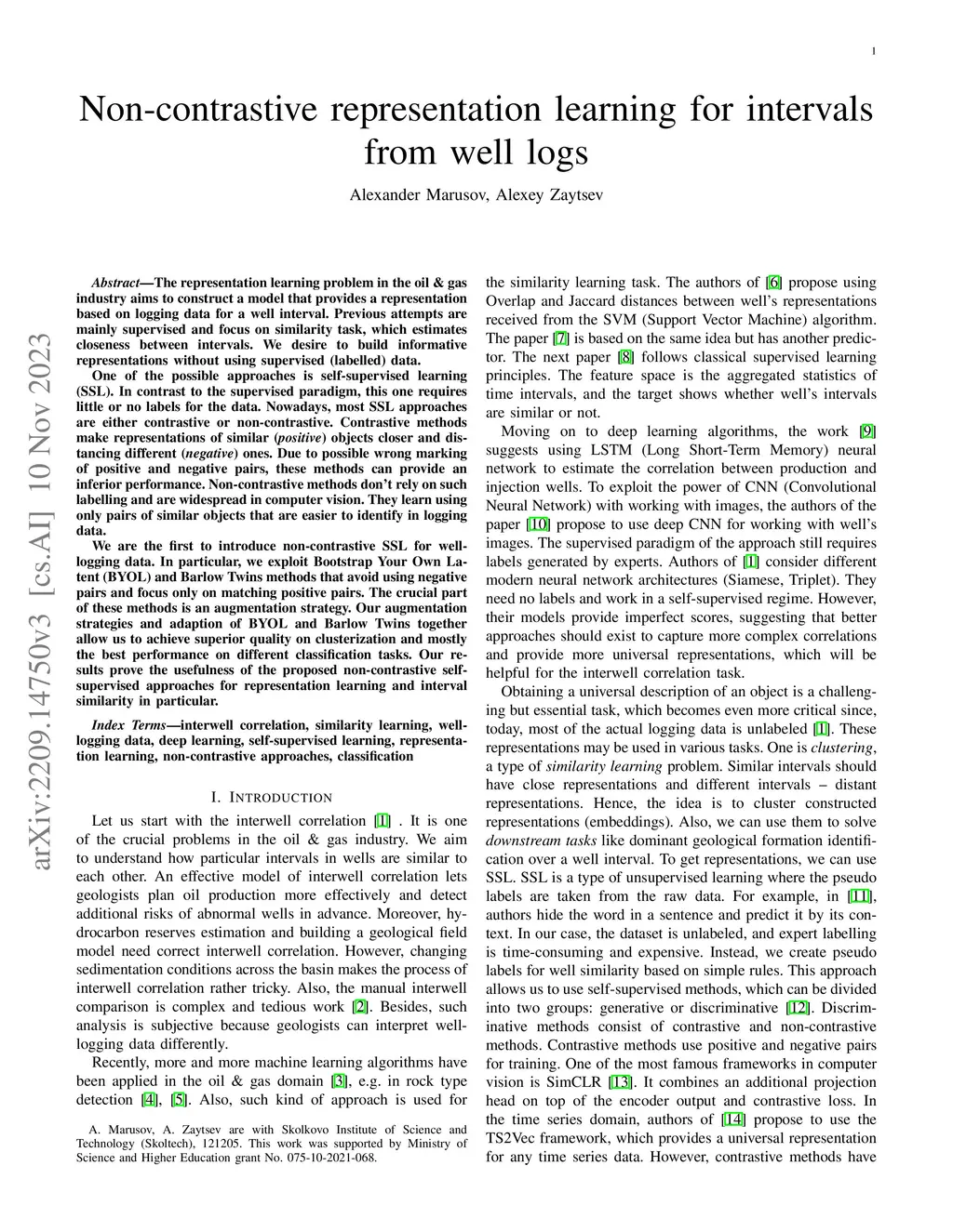 The representation learning problem in the oil & gas industry aims to construct a model that provides a representation based on logging data for a well interval. Previous attempts are mainly supervised and focus on similarity task, which estimates closeness between intervals. We desire to build informative representations without using supervised (labelled) data. One of the possible approaches is self-supervised learning (SSL). In contrast to the supervised paradigm, this one requires little or no labels for the data. Nowadays, most SSL approaches are either contrastive or non-contrastive. Contrastive methods make representations of similar (positive) objects closer and distancing different (negative) ones. Due to possible wrong marking of positive and negative pairs, these methods can provide an inferior performance. Non-contrastive methods don't rely on such labelling and are widespread in computer vision. They learn using only pairs of similar objects that are easier to identify in logging data. We are the first to introduce non-contrastive SSL for well-logging data. In particular, we exploit Bootstrap Your Own Latent (BYOL) and Barlow Twins methods that avoid using negative pairs and focus only on matching positive pairs. The crucial part of these methods is an augmentation strategy. Our augmentation strategies and adaption of BYOL and Barlow Twins together allow us to achieve superior quality on clusterization and mostly the best performance on different classification tasks. Our results prove the usefulness of the proposed non-contrastive self-supervised approaches for representation learning and interval similarity in particular.