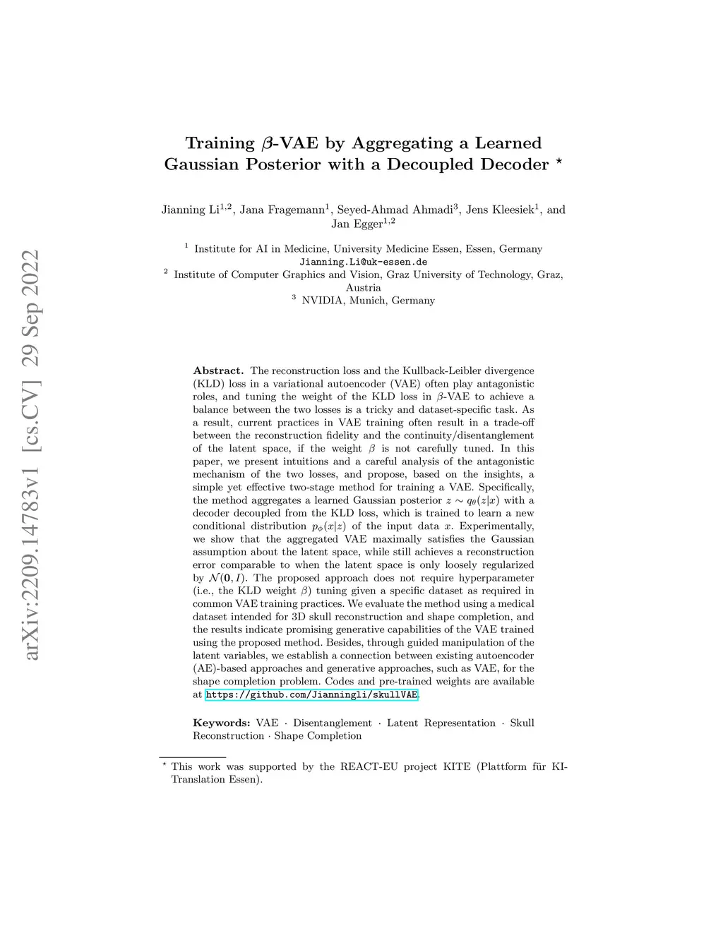 The reconstruction loss and the Kullback-Leibler divergence (KLD) loss in a variational autoencoder (VAE) often play antagonistic roles, and tuning the weight of the KLD loss in -VAE to achieve a balance between the two losses is a tricky and dataset-specific task. As a result, current practices in VAE training often result in a trade-off between the reconstruction fidelity and the continuitydisentanglement of the latent space, if the weight is not carefully tuned. In this paper, we present intuitions and a careful analysis of the antagonistic mechanism of the two losses, and propose, based on the insights, a simple yet effective two-stage method for training a VAE. Specifically, the method aggregates a learned Gaussian posterior with a decoder decoupled from the KLD loss, which is trained to learn a new conditional distribution of the input data . Experimentally, we show that the aggregated VAE maximally satisfies the Gaussian assumption about the latent space, while still achieves a reconstruction error comparable to when the latent space is only loosely regularized by . The proposed approach does not require hyperparameter (i.e., the KLD weight ) tuning given a specific dataset as required in common VAE training practices. We evaluate the method using a medical dataset intended for 3D skull reconstruction and shape completion, and the results indicate promising generative capabilities of the VAE trained using the proposed method. Besides, through guided manipulation of the latent variables, we establish a connection between existing autoencoder (AE)-based approaches and generative approaches, such as VAE, for the shape completion problem. Codes and pre-trained weights are available at https://github.com/Jianningli/skullVAE