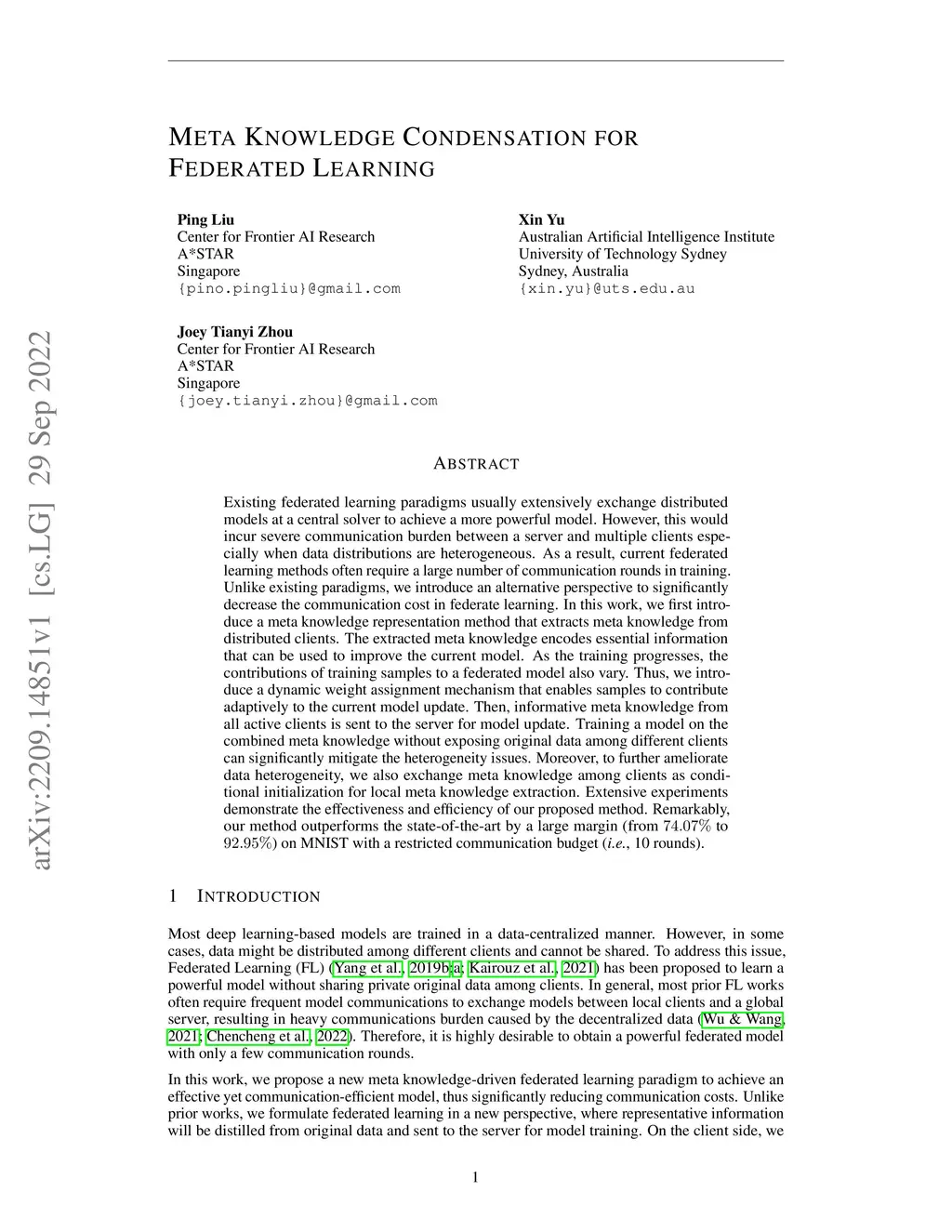 Existing federated learning paradigms usually extensively exchange distributed models at a central solver to achieve a more powerful model. However, this would incur severe communication burden between a server and multiple clients especially when data distributions are heterogeneous. As a result, current federated learning methods often require a large number of communication rounds in training. Unlike existing paradigms, we introduce an alternative perspective to significantly decrease the communication cost in federate learning. In this work, we first introduce a meta knowledge representation method that extracts meta knowledge from distributed clients. The extracted meta knowledge encodes essential information that can be used to improve the current model. As the training progresses, the contributions of training samples to a federated model also vary. Thus, we introduce a dynamic weight assignment mechanism that enables samples to contribute adaptively to the current model update. Then, informative meta knowledge from all active clients is sent to the server for model update. Training a model on the combined meta knowledge without exposing original data among different clients can significantly mitigate the heterogeneity issues. Moreover, to further ameliorate data heterogeneity, we also exchange meta knowledge among clients as conditional initialization for local meta knowledge extraction. Extensive experiments demonstrate the effectiveness and efficiency of our proposed method. Remarkably, our method outperforms the state-of-the-art by a large margin (from to ) on MNIST with a restricted communication budget (i.e. 10 rounds).