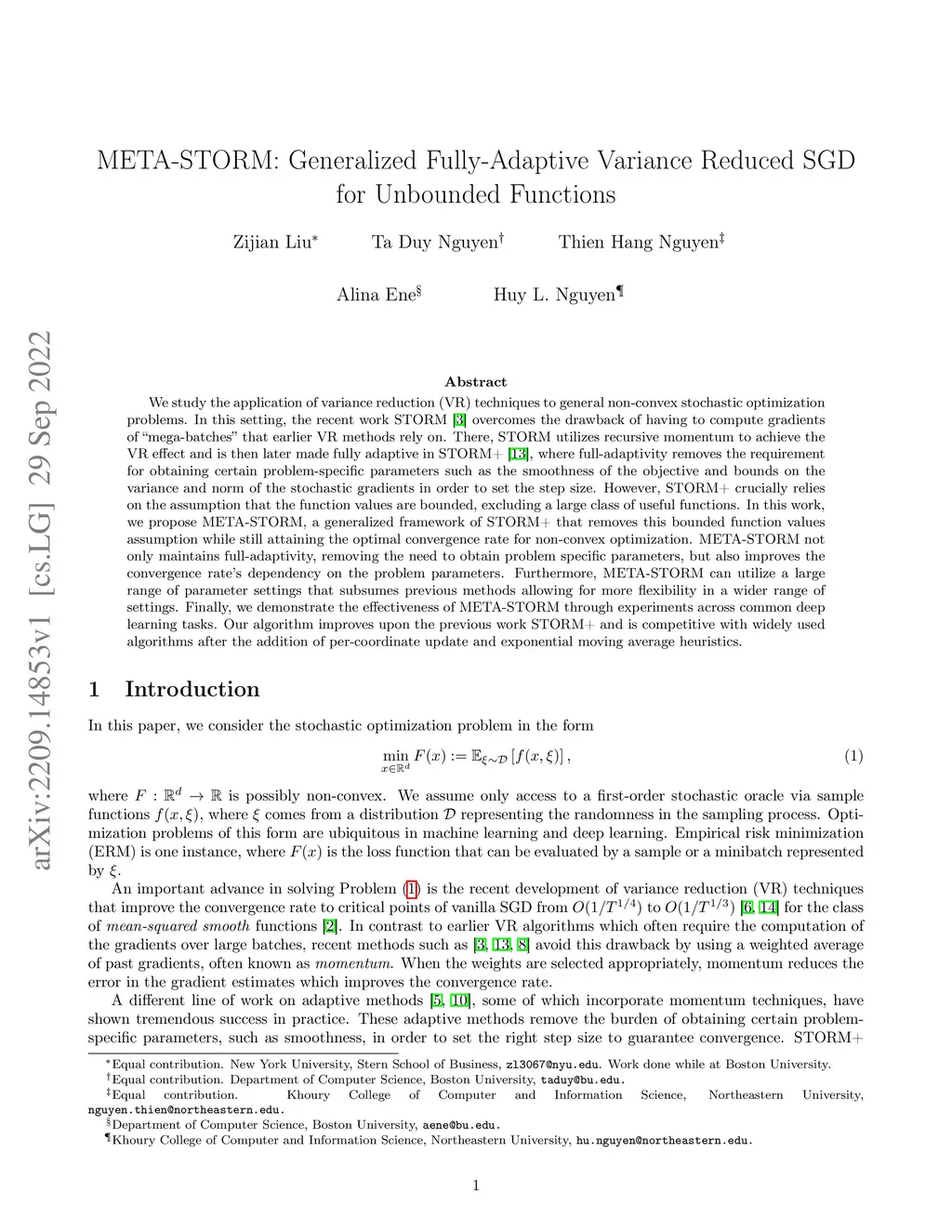 We study the application of variance reduction (VR) techniques to general non-convex stochastic optimization problems. In this setting, the recent work STORM [Cutkosky-Orabona '19] overcomes the drawback of having to compute gradients of "mega-batches" that earlier VR methods rely on. There, STORM utilizes recursive momentum to achieve the VR effect and is then later made fully adaptive in STORM+ [Levy et al., '21], where full-adaptivity removes the requirement for obtaining certain problem-specific parameters such as the smoothness of the objective and bounds on the variance and norm of the stochastic gradients in order to set the step size. However, STORM+ crucially relies on the assumption that the function values are bounded, excluding a large class of useful functions. In this work, we propose META-STORM, a generalized framework of STORM+ that removes this bounded function values assumption while still attaining the optimal convergence rate for non-convex optimization. META-STORM not only maintains full-adaptivity, removing the need to obtain problem specific parameters, but also improves the convergence rate's dependency on the problem parameters. Furthermore, META-STORM can utilize a large range of parameter settings that subsumes previous methods allowing for more flexibility in a wider range of settings. Finally, we demonstrate the effectiveness of META-STORM through experiments across common deep learning tasks. Our algorithm improves upon the previous work STORM+ and is competitive with widely used algorithms after the addition of per-coordinate update and exponential moving average heuristics.