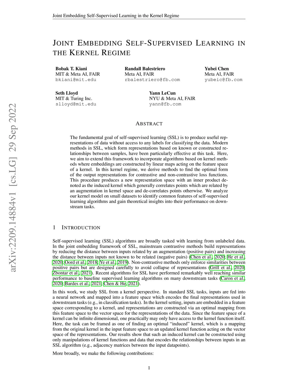 The fundamental goal of self-supervised learning (SSL) is to produce useful representations of data without access to any labels for classifying the data. Modern methods in SSL, which form representations based on known or constructed relationships between samples, have been particularly effective at this task. Here, we aim to extend this framework to incorporate algorithms based on kernel methods where embeddings are constructed by linear maps acting on the feature space of a kernel. In this kernel regime, we derive methods to find the optimal form of the output representations for contrastive and non-contrastive loss functions. This procedure produces a new representation space with an inner product denoted as the induced kernel which generally correlates points which are related by an augmentation in kernel space and de-correlates points otherwise. We analyze our kernel model on small datasets to identify common features of self-supervised learning algorithms and gain theoretical insights into their performance on downstream tasks.