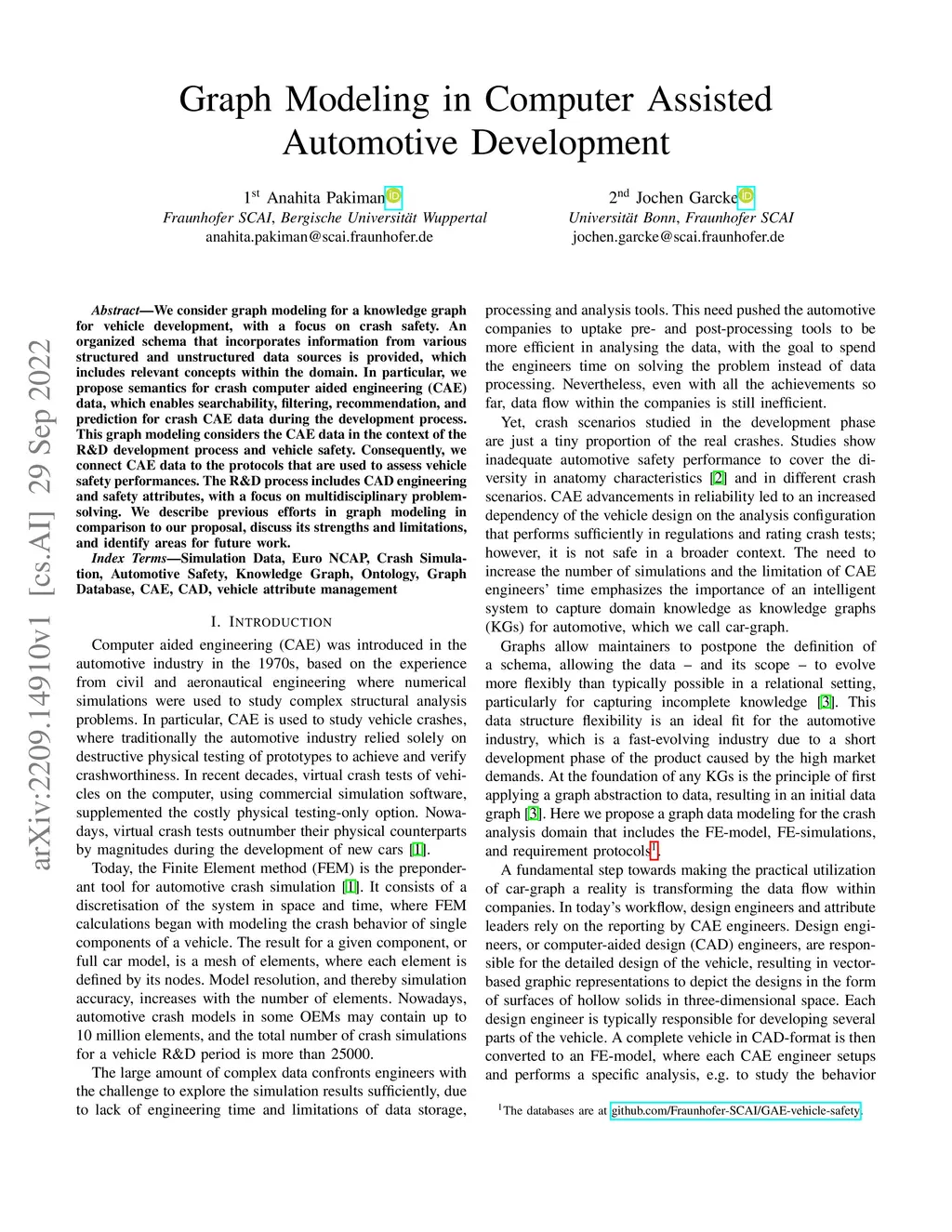 We consider graph modeling for a knowledge graph for vehicle development, with a focus on crash safety. An organized schema that incorporates information from various structured and unstructured data sources is provided, which includes relevant concepts within the domain. In particular, we propose semantics for crash computer aided engineering (CAE) data, which enables searchability, filtering, recommendation, and prediction for crash CAE data during the development process. This graph modeling considers the CAE data in the context of the R\&D development process and vehicle safety. Consequently, we connect CAE data to the protocols that are used to assess vehicle safety performances. The R\&D process includes CAD engineering and safety attributes, with a focus on multidisciplinary problem-solving. We describe previous efforts in graph modeling in comparison to our proposal, discuss its strengths and limitations, and identify areas for future work.