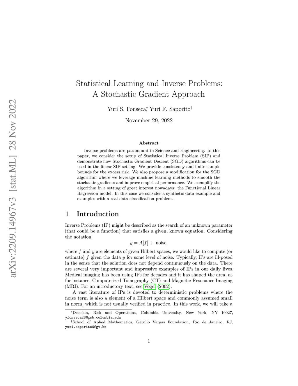 Inverse problems are paramount in Science and Engineering. In this paper, we consider the setup of Statistical Inverse Problem (SIP) and demonstrate how Stochastic Gradient Descent (SGD) algorithms can be used in the linear SIP setting. We provide consistency and finite sample bounds for the excess risk. We also propose a modification for the SGD algorithm where we leverage machine learning methods to smooth the stochastic gradients and improve empirical performance. We exemplify the algorithm in a setting of great interest nowadays: the Functional Linear Regression model. In this case we consider a synthetic data example and examples with a real data classification problem.