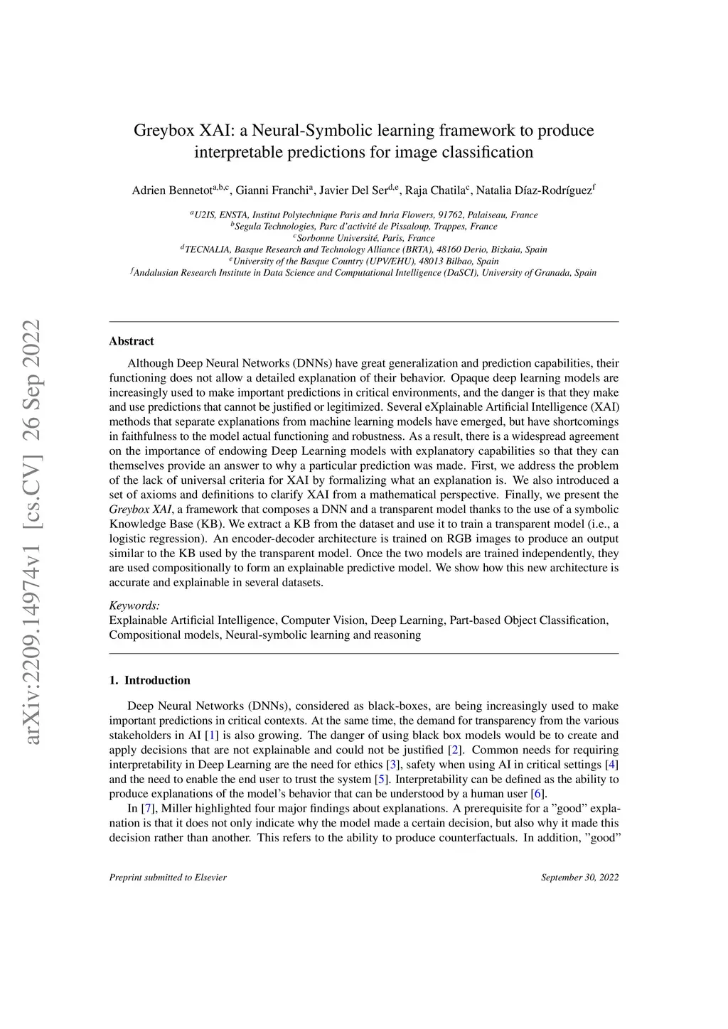 Although Deep Neural Networks (DNNs) have great generalization and prediction capabilities, their functioning does not allow a detailed explanation of their behavior. Opaque deep learning models are increasingly used to make important predictions in critical environments, and the danger is that they make and use predictions that cannot be justified or legitimized. Several eXplainable Artificial Intelligence (XAI) methods that separate explanations from machine learning models have emerged, but have shortcomings in faithfulness to the model actual functioning and robustness. As a result, there is a widespread agreement on the importance of endowing Deep Learning models with explanatory capabilities so that they can themselves provide an answer to why a particular prediction was made. First, we address the problem of the lack of universal criteria for XAI by formalizing what an explanation is. We also introduced a set of axioms and definitions to clarify XAI from a mathematical perspective. Finally, we present the Greybox XAI, a framework that composes a DNN and a transparent model thanks to the use of a symbolic Knowledge Base (KB). We extract a KB from the dataset and use it to train a transparent model (i.e., a logistic regression). An encoder-decoder architecture is trained on RGB images to produce an output similar to the KB used by the transparent model. Once the two models are trained independently, they are used compositionally to form an explainable predictive model. We show how this new architecture is accurate and explainable in several datasets.