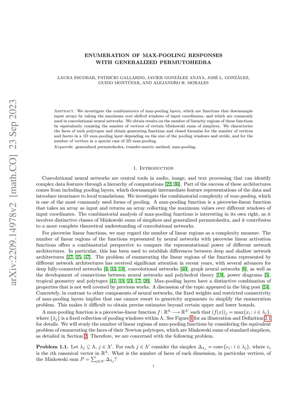 We investigate the combinatorics of max-pooling layers, which are functions that downsample input arrays by taking the maximum over shifted windows of input coordinates, and which are commonly used in convolutional neural networks. We obtain results on the number of linearity regions of these functions by equivalently counting the number of vertices of certain Minkowski sums of simplices. We characterize the faces of such polytopes and obtain generating functions and closed formulas for the number of vertices and facets in a 1D max-pooling layer depending on the size of the pooling windows and stride, and for the number of vertices in a special case of 2D max-pooling.