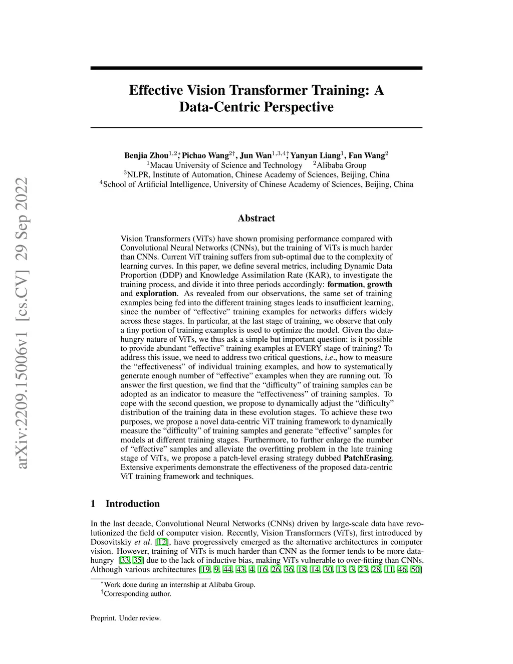 Vision Transformers (ViTs) have shown promising performance compared with Convolutional Neural Networks (CNNs), but the training of ViTs is much harder than CNNs. In this paper, we define several metrics, including Dynamic Data Proportion (DDP) and Knowledge Assimilation Rate (KAR), to investigate the training process, and divide it into three periods accordingly: formation, growth and exploration. In particular, at the last stage of training, we observe that only a tiny portion of training examples is used to optimize the model. Given the data-hungry nature of ViTs, we thus ask a simple but important question: is it possible to provide abundant ``effective'' training examples at EVERY stage of training? To address this issue, we need to address two critical questions, \ie, how to measure the ``effectiveness'' of individual training examples, and how to systematically generate enough number of ``effective'' examples when they are running out. To answer the first question, we find that the ``difficulty'' of training samples can be adopted as an indicator to measure the ``effectiveness'' of training samples. To cope with the second question, we propose to dynamically adjust the ``difficulty'' distribution of the training data in these evolution stages. To achieve these two purposes, we propose a novel data-centric ViT training framework to dynamically measure the ``difficulty'' of training samples and generate ``effective'' samples for models at different training stages. Furthermore, to further enlarge the number of ``effective'' samples and alleviate the overfitting problem in the late training stage of ViTs, we propose a patch-level erasing strategy dubbed PatchErasing. Extensive experiments demonstrate the effectiveness of the proposed data-centric ViT training framework and techniques.