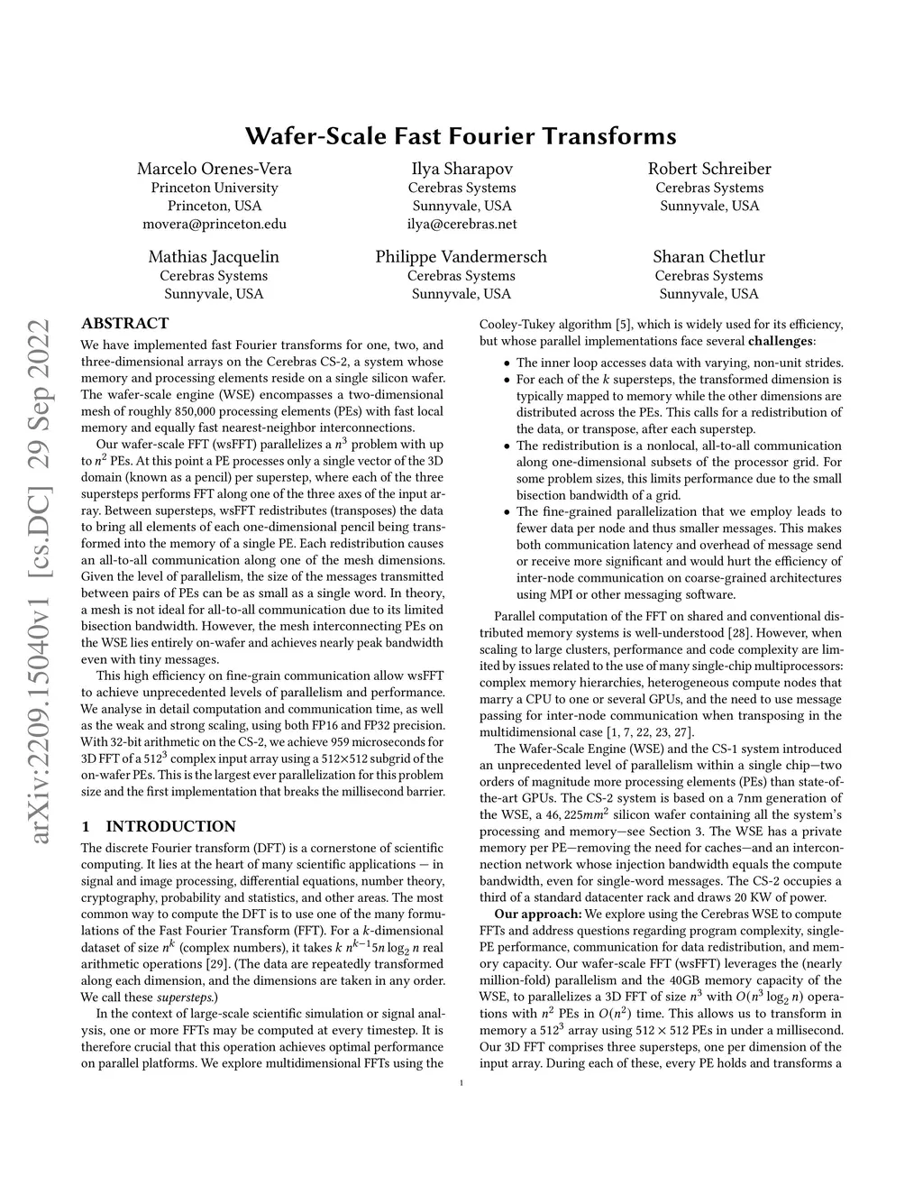 We have implemented fast Fourier transforms for one, two, and three-dimensional arrays on the Cerebras CS-2, a system whose memory and processing elements reside on a single silicon wafer. The wafer-scale engine (WSE) encompasses a two-dimensional mesh of roughly 850,000 processing elements (PEs) with fast local memory and equally fast nearest-neighbor interconnections. Our wafer-scale FFT (wsFFT) parallelizes a problem with up to PEs. At this point a PE processes only a single vector of the 3D domain (known as a pencil) per superstep, where each of the three supersteps performs FFT along one of the three axes of the input array. Between supersteps, wsFFT redistributes (transposes) the data to bring all elements of each one-dimensional pencil being transformed into the memory of a single PE. Each redistribution causes an all-to-all communication along one of the mesh dimensions. Given the level of parallelism, the size of the messages transmitted between pairs of PEs can be as small as a single word. In theory, a mesh is not ideal for all-to-all communication due to its limited bisection bandwidth. However, the mesh interconnecting PEs on the WSE lies entirely on-wafer and achieves nearly peak bandwidth even with tiny messages. This high efficiency on fine-grain communication allow wsFFT to achieve unprecedented levels of parallelism and performance. We analyse in detail computation and communication time, as well as the weak and strong scaling, using both FP16 and FP32 precision. With 32-bit arithmetic on the CS-2, we achieve 959 microseconds for 3D FFT of a complex input array using a 512x512 subgrid of the on-wafer PEs. This is the largest ever parallelization for this problem size and the first implementation that breaks the millisecond barrier.