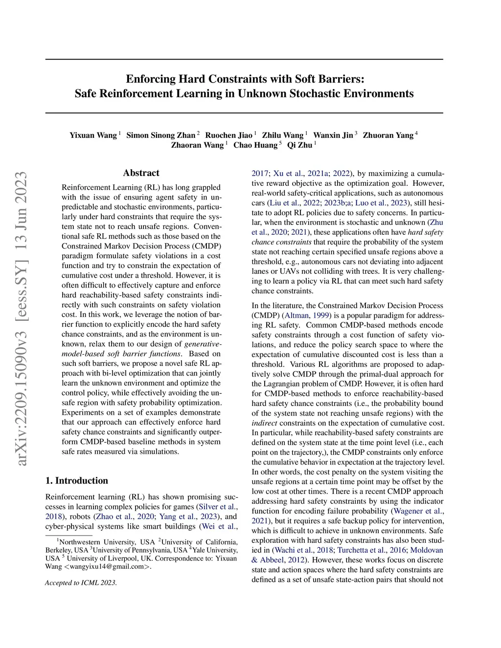 It is quite challenging to ensure the safety of reinforcement learning (RL) agents in an unknown and stochastic environment under hard constraints that require the system state not to reach certain specified unsafe regions. Many popular safe RL methods such as those based on the Constrained Markov Decision Process (CMDP) paradigm formulate safety violations in a cost function and try to constrain the expectation of cumulative cost under a threshold. However, it is often difficult to effectively capture and enforce hard reachability-based safety constraints indirectly with such constraints on safety violation costs. In this work, we leverage the notion of barrier function to explicitly encode the hard safety constraints, and given that the environment is unknown, relax them to our design of \emph{generative-model-based soft barrier functions}. Based on such soft barriers, we propose a safe RL approach that can jointly learn the environment and optimize the control policy, while effectively avoiding unsafe regions with safety probability optimization. Experiments on a set of examples demonstrate that our approach can effectively enforce hard safety constraints and significantly outperform CMDP-based baseline methods in system safe rate measured via simulations.