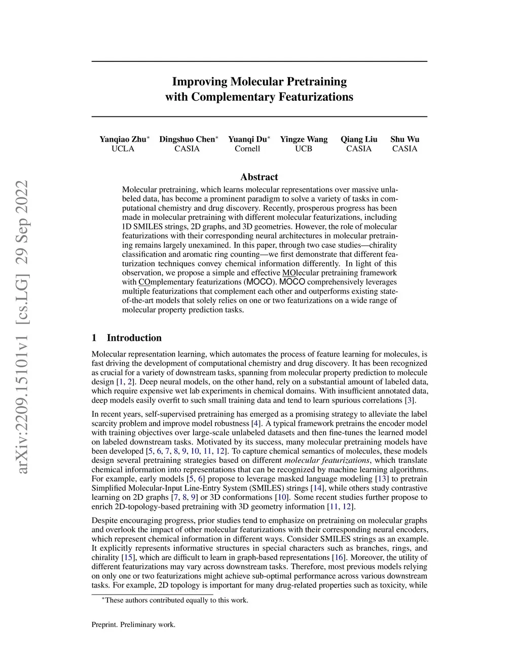 Molecular pretraining, which learns molecular representations over massive unlabeled data, has become a prominent paradigm to solve a variety of tasks in computational chemistry and drug discovery. Recently, prosperous progress has been made in molecular pretraining with different molecular featurizations, including 1D SMILES strings, 2D graphs, and 3D geometries. However, the role of molecular featurizations with their corresponding neural architectures in molecular pretraining remains largely unexamined. In this paper, through two case studies -- chirality classification and aromatic ring counting -- we first demonstrate that different featurization techniques convey chemical information differently. In light of this observation, we propose a simple and effective MOlecular pretraining framework with COmplementary featurizations (MOCO). MOCO comprehensively leverages multiple featurizations that complement each other and outperforms existing state-of-the-art models that solely relies on one or two featurizations on a wide range of molecular property prediction tasks.