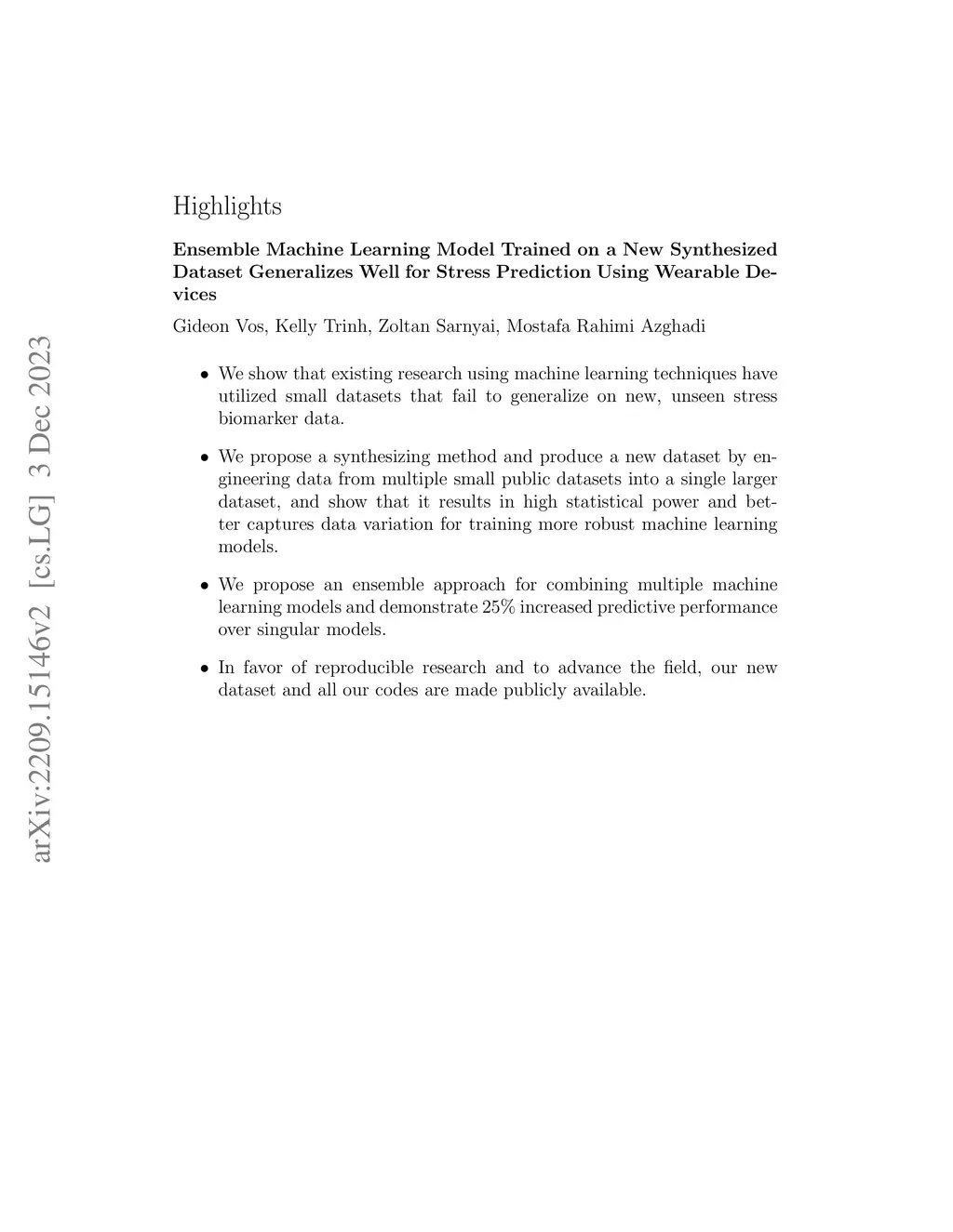 Introduction. We investigate the generalization ability of models built on datasets containing a small number of subjects, recorded in single study protocols. Next, we propose and evaluate methods combining these datasets into a single, large dataset. Finally, we propose and evaluate the use of ensemble techniques by combining gradient boosting with an artificial neural network to measure predictive power on new, unseen data. Methods. Sensor biomarker data from six public datasets were utilized in this study. To test model generalization, we developed a gradient boosting model trained on one dataset (SWELL), and tested its predictive power on two datasets previously used in other studies (WESAD, NEURO). Next, we merged four small datasets, i.e. (SWELL, NEURO, WESAD, UBFC-Phys), to provide a combined total of 99 subjects,. In addition, we utilized random sampling combined with another dataset (EXAM) to build a larger training dataset consisting of 200 synthesized subjects,. Finally, we developed an ensemble model that combines our gradient boosting model with an artificial neural network, and tested it on two additional, unseen publicly available stress datasets (WESAD and Toadstool). Results. Our method delivers a robust stress measurement system capable of achieving 85% predictive accuracy on new, unseen validation data, achieving a 25% performance improvement over single models trained on small datasets. Conclusion. Models trained on small, single study protocol datasets do not generalize well for use on new, unseen data and lack statistical power. Ma-chine learning models trained on a dataset containing a larger number of varied study subjects capture physiological variance better, resulting in more robust stress detection.
