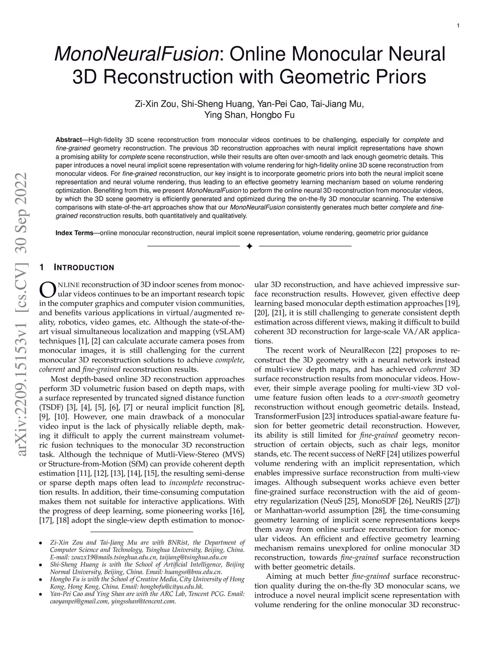 High-fidelity 3D scene reconstruction from monocular videos continues to be challenging, especially for complete and fine-grained geometry reconstruction. The previous 3D reconstruction approaches with neural implicit representations have shown a promising ability for complete scene reconstruction, while their results are often over-smooth and lack enough geometric details. This paper introduces a novel neural implicit scene representation with volume rendering for high-fidelity online 3D scene reconstruction from monocular videos. For fine-grained reconstruction, our key insight is to incorporate geometric priors into both the neural implicit scene representation and neural volume rendering, thus leading to an effective geometry learning mechanism based on volume rendering optimization. Benefiting from this, we present MonoNeuralFusion to perform the online neural 3D reconstruction from monocular videos, by which the 3D scene geometry is efficiently generated and optimized during the on-the-fly 3D monocular scanning. The extensive comparisons with state-of-the-art approaches show that our MonoNeuralFusion consistently generates much better complete and fine-grained reconstruction results, both quantitatively and qualitatively.