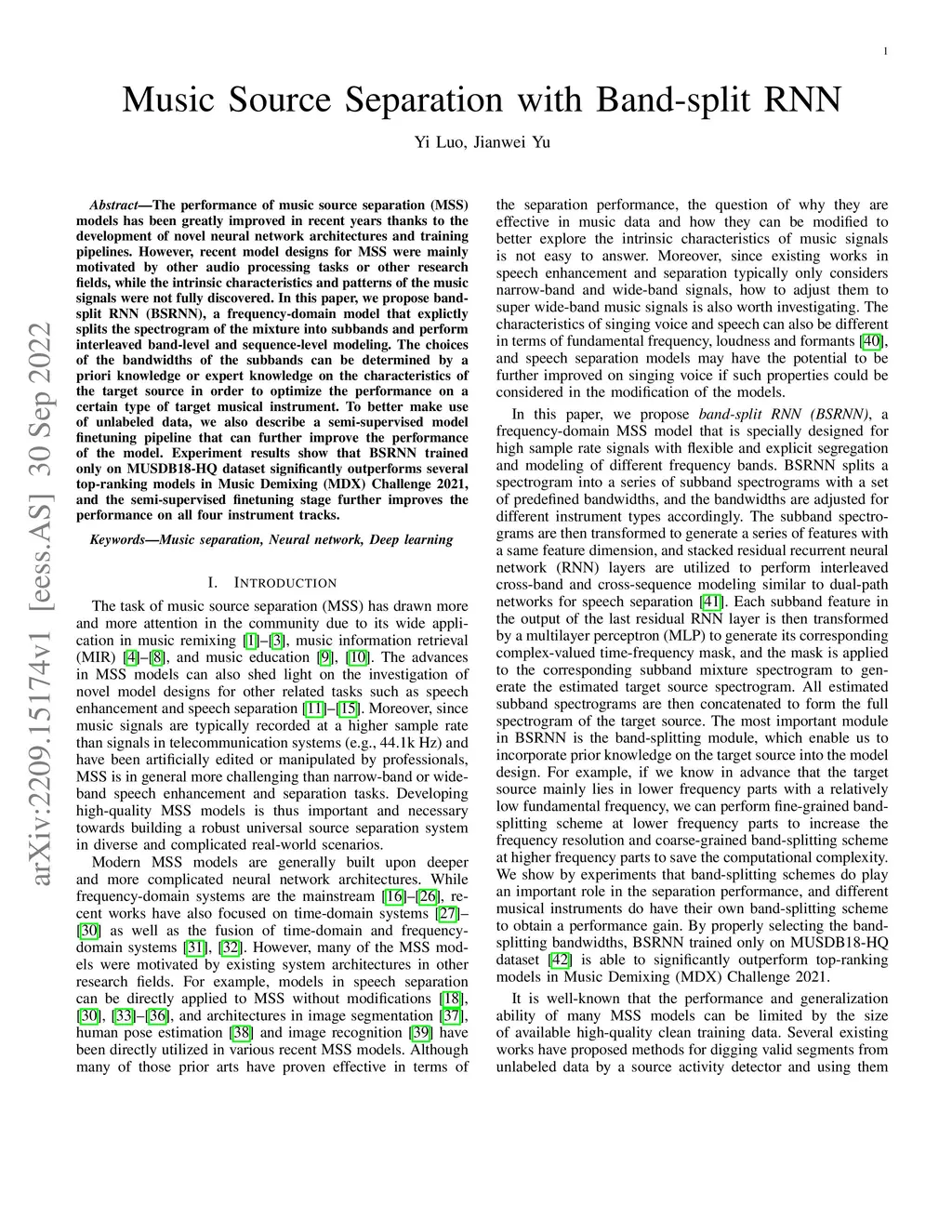 The performance of music source separation (MSS) models has been greatly improved in recent years thanks to the development of novel neural network architectures and training pipelines. However, recent model designs for MSS were mainly motivated by other audio processing tasks or other research fields, while the intrinsic characteristics and patterns of the music signals were not fully discovered. In this paper, we propose band-split RNN (BSRNN), a frequency-domain model that explictly splits the spectrogram of the mixture into subbands and perform interleaved band-level and sequence-level modeling. The choices of the bandwidths of the subbands can be determined by a priori knowledge or expert knowledge on the characteristics of the target source in order to optimize the performance on a certain type of target musical instrument. To better make use of unlabeled data, we also describe a semi-supervised model finetuning pipeline that can further improve the performance of the model. Experiment results show that BSRNN trained only on MUSDB18-HQ dataset significantly outperforms several top-ranking models in Music Demixing (MDX) Challenge 2021, and the semi-supervised finetuning stage further improves the performance on all four instrument tracks.