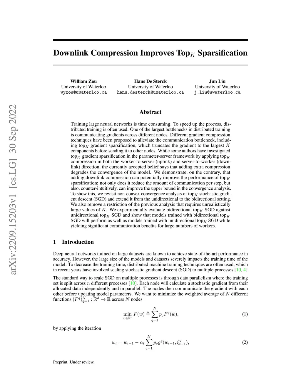 Training large neural networks is time consuming. To speed up the process, distributed training is often used. One of the largest bottlenecks in distributed training is communicating gradients across different nodes. Different gradient compression techniques have been proposed to alleviate the communication bottleneck, including topK gradient sparsification, which truncates the gradient to the largest K components before sending it to other nodes. While some authors have investigated topK gradient sparsification in the parameter-server framework by applying topK compression in both the worker-to-server (uplink) and server-to-worker (downlink) direction, the currently accepted belief says that adding extra compression degrades the convergence of the model. We demonstrate, on the contrary, that adding downlink compression can potentially improve the performance of topK sparsification: not only does it reduce the amount of communication per step, but also, counter-intuitively, can improve the upper bound in the convergence analysis. To show this, we revisit non-convex convergence analysis of topK stochastic gradient descent (SGD) and extend it from the unidirectional to the bidirectional setting. We also remove a restriction of the previous analysis that requires unrealistically large values of K. We experimentally evaluate bidirectional topK SGD against unidirectional topK SGD and show that models trained with bidirectional topK SGD will perform as well as models trained with unidirectional topK SGD while yielding significant communication benefits for large numbers of workers.
