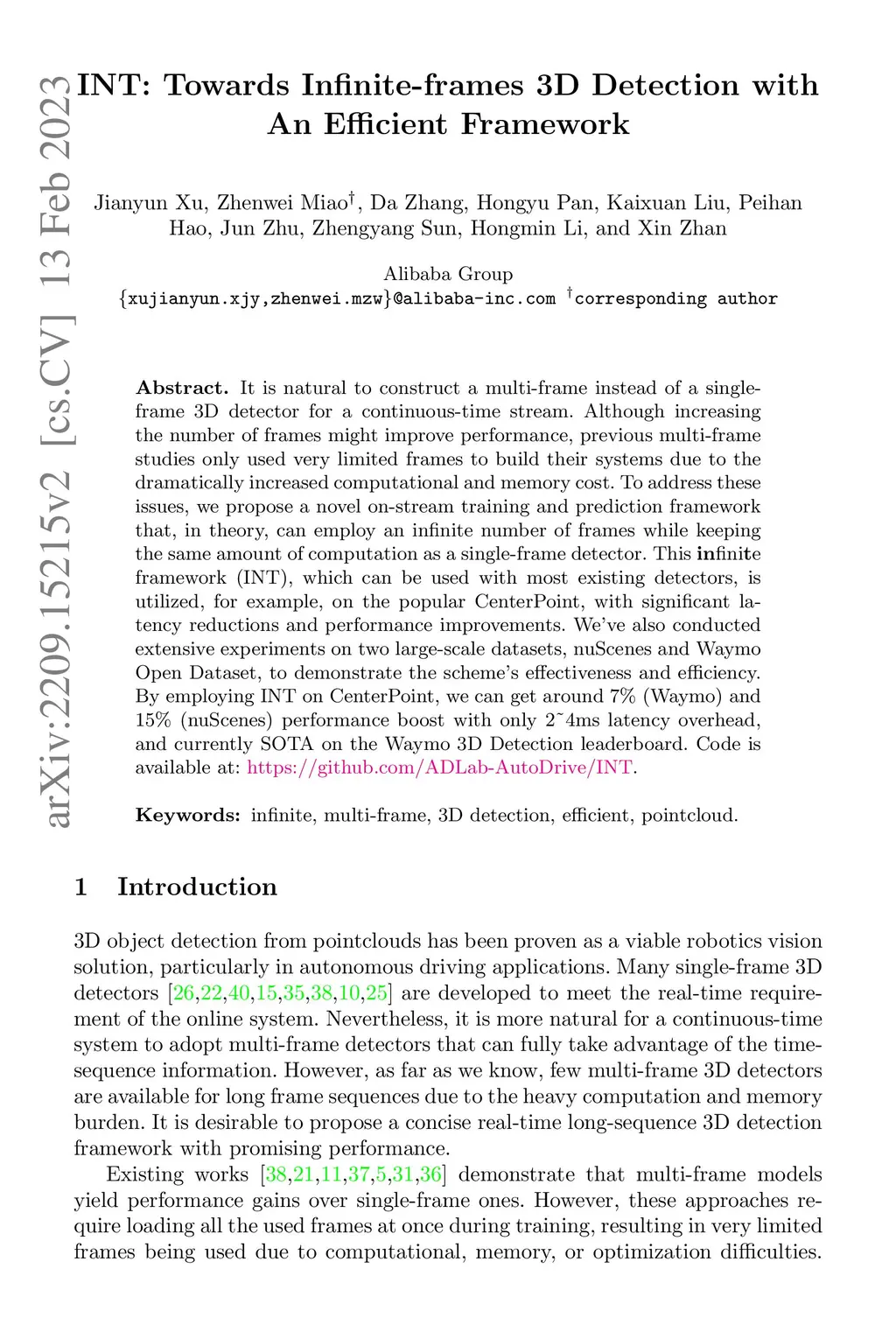 INT: Towards Infinite-frames 3D Detection with An Efficient Framework
