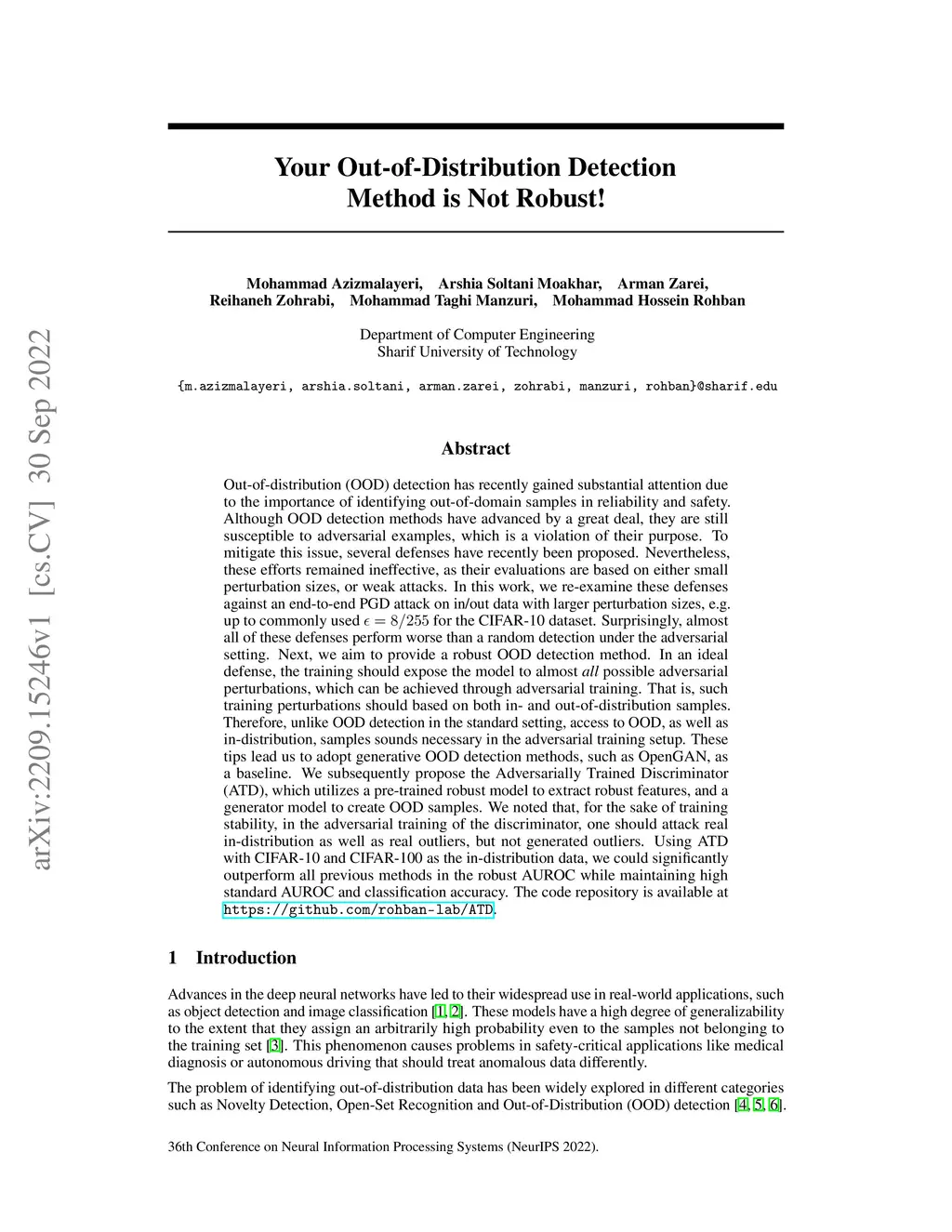 Out-of-distribution (OOD) detection has recently gained substantial attention due to the importance of identifying out-of-domain samples in reliability and safety. Although OOD detection methods have advanced by a great deal, they are still susceptible to adversarial examples, which is a violation of their purpose. To mitigate this issue, several defenses have recently been proposed. Nevertheless, these efforts remained ineffective, as their evaluations are based on either small perturbation sizes, or weak attacks. In this work, we re-examine these defenses against an end-to-end PGD attack on in/out data with larger perturbation sizes, e.g. up to commonly used for the CIFAR-10 dataset. Surprisingly, almost all of these defenses perform worse than a random detection under the adversarial setting. Next, we aim to provide a robust OOD detection method. In an ideal defense, the training should expose the model to almost all possible adversarial perturbations, which can be achieved through adversarial training. That is, such training perturbations should based on both in- and out-of-distribution samples. Therefore, unlike OOD detection in the standard setting, access to OOD, as well as in-distribution, samples sounds necessary in the adversarial training setup. These tips lead us to adopt generative OOD detection methods, such as OpenGAN, as a baseline. We subsequently propose the Adversarially Trained Discriminator (ATD), which utilizes a pre-trained robust model to extract robust features, and a generator model to create OOD samples. Using ATD with CIFAR-10 and CIFAR-100 as the in-distribution data, we could significantly outperform all previous methods in the robust AUROC while maintaining high standard AUROC and classification accuracy. The code repository is available at https://github.com/rohban-lab/ATD .