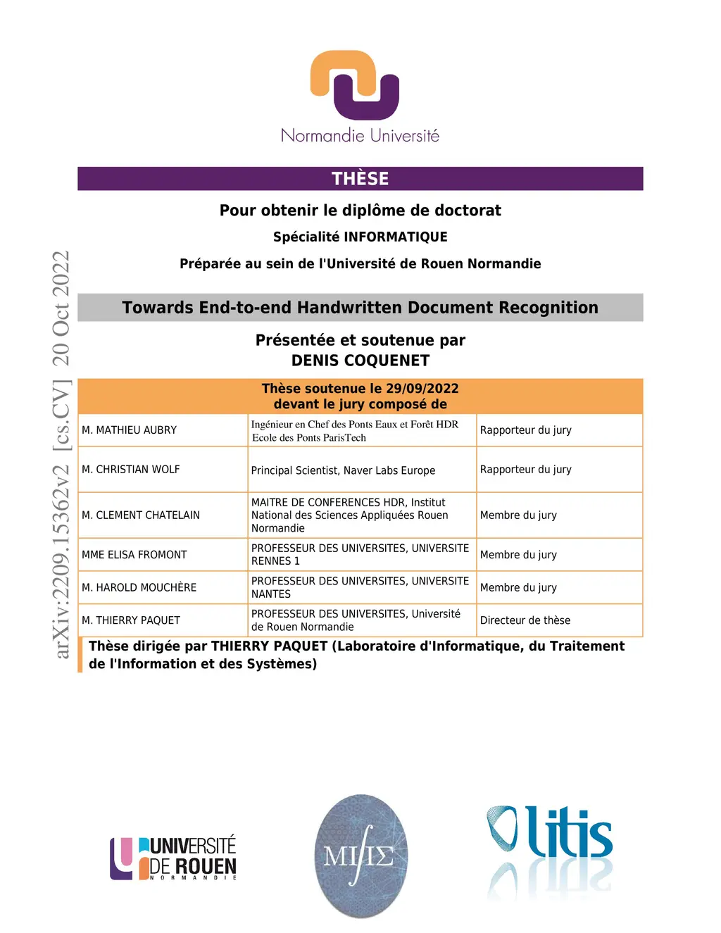 Handwritten text recognition has been widely studied in the last decades for its numerous applications. Nowadays, the state-of-the-art approach consists in a three-step process. The document is segmented into text lines, which are then ordered and recognized. However, this three-step approach has many drawbacks. The three steps are treated independently whereas they are closely related. Errors accumulate from one step to the other. The ordering step is based on heuristic rules which prevent its use for documents with a complex layouts or for heterogeneous documents. The need for additional physical segmentation annotations for training the segmentation stage is inherent to this approach. In this thesis, we propose to tackle these issues by performing the handwritten text recognition of whole document in an end-to-end way. To this aim, we gradually increase the difficulty of the recognition task, moving from isolated lines to paragraphs, and then to whole documents. We proposed an approach at the line level, based on a fully convolutional network, in order to design a first generic feature extraction step for the handwriting recognition task. Based on this preliminary work, we studied two different approaches to recognize handwritten paragraphs. We reached state-of-the-art results at paragraph level on the RIMES 2011, IAM and READ 2016 datasets and outperformed the line-level state of the art on these datasets. We finally proposed the first end-to-end approach dedicated to the recognition of both text and layout, at document level. Characters and layout tokens are sequentially predicted following a learned reading order. We proposed two new metrics we used to evaluate this task on the RIMES 2009 and READ 2016 dataset, at page level and double-page level.