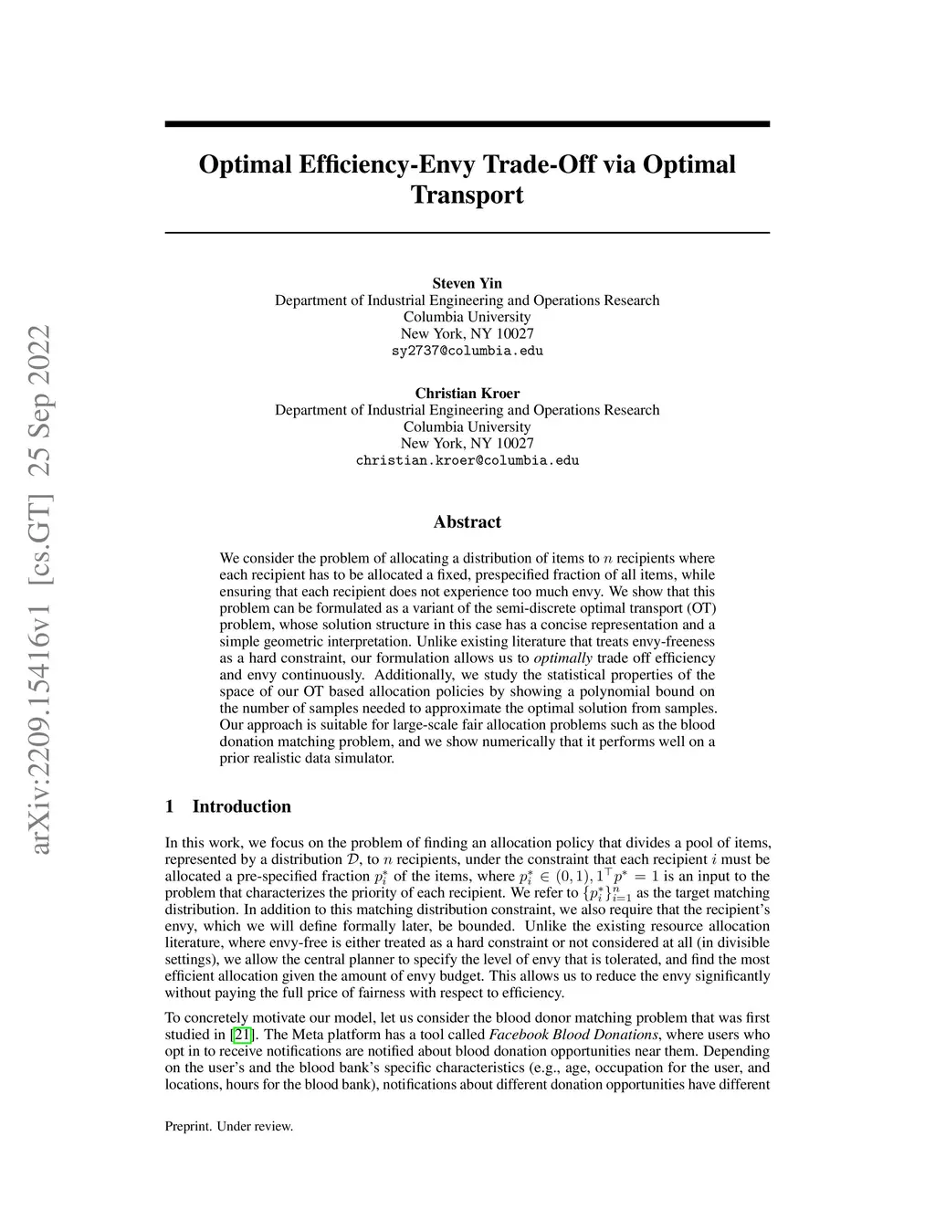 Optimal Efficiency-Envy Trade-Off via Optimal Transport