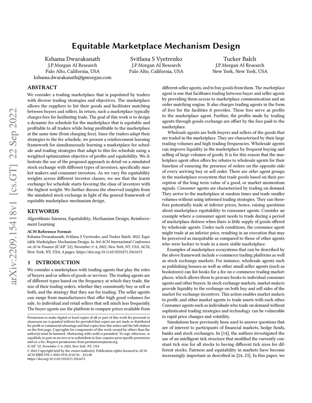 We consider a trading marketplace that is populated by traders with diverse trading strategies and objectives. The marketplace allows the suppliers to list their goods and facilitates matching between buyers and sellers. In return, such a marketplace typically charges fees for facilitating trade. The goal of this work is to design a dynamic fee schedule for the marketplace that is equitable and profitable to all traders while being profitable to the marketplace at the same time (from charging fees). Since the traders adapt their strategies to the fee schedule, we present a reinforcement learning framework for simultaneously learning a marketplace fee schedule and trading strategies that adapt to this fee schedule using a weighted optimization objective of profits and equitability. We illustrate the use of the proposed approach in detail on a simulated stock exchange with different types of investors, specifically market makers and consumer investors. As we vary the equitability weights across different investor classes, we see that the learnt exchange fee schedule starts favoring the class of investors with the highest weight. We further discuss the observed insights from the simulated stock exchange in light of the general framework of equitable marketplace mechanism design.