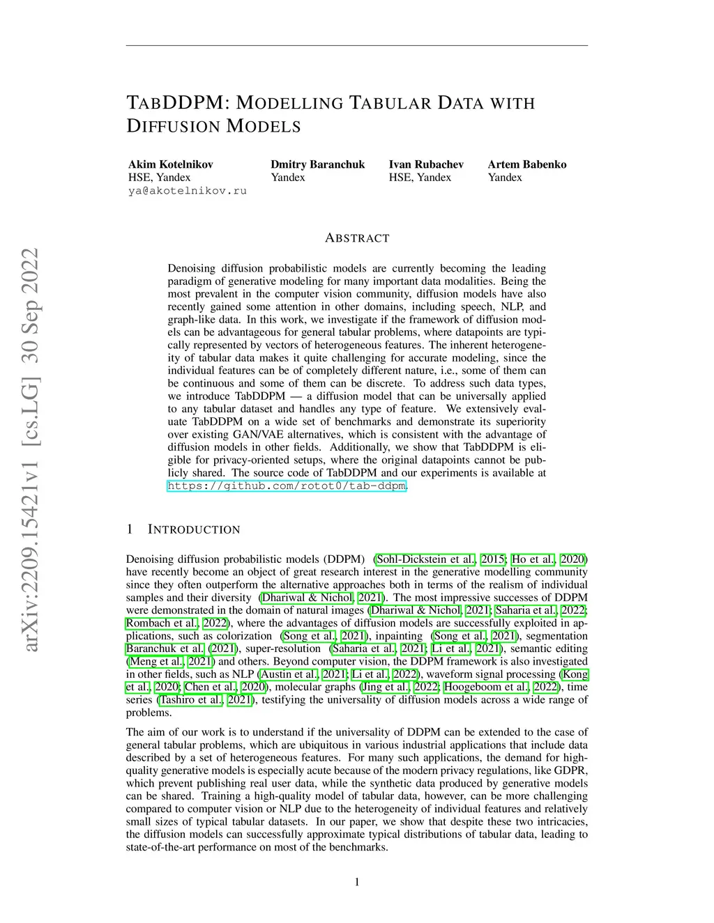 Denoising diffusion probabilistic models are currently becoming the leading paradigm of generative modeling for many important data modalities. Being the most prevalent in the computer vision community, diffusion models have also recently gained some attention in other domains, including speech, NLP, and graph-like data. In this work, we investigate if the framework of diffusion models can be advantageous for general tabular problems, where datapoints are typically represented by vectors of heterogeneous features. The inherent heterogeneity of tabular data makes it quite challenging for accurate modeling, since the individual features can be of completely different nature, i.e., some of them can be continuous and some of them can be discrete. To address such data types, we introduce TabDDPM -- a diffusion model that can be universally applied to any tabular dataset and handles any type of feature. We extensively evaluate TabDDPM on a wide set of benchmarks and demonstrate its superiority over existing GAN/VAE alternatives, which is consistent with the advantage of diffusion models in other fields. Additionally, we show that TabDDPM is eligible for privacy-oriented setups, where the original datapoints cannot be publicly shared.