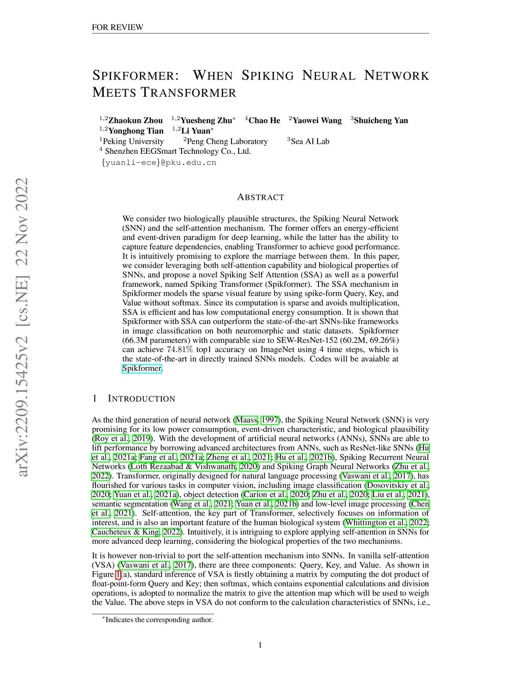 We consider two biologically plausible structures, the Spiking Neural Network (SNN) and the self-attention mechanism. The former offers an energy-efficient and event-driven paradigm for deep learning, while the latter has the ability to capture feature dependencies, enabling Transformer to achieve good performance. It is intuitively promising to explore the marriage between them. In this paper, we consider leveraging both self-attention capability and biological properties of SNNs, and propose a novel Spiking Self Attention (SSA) as well as a powerful framework, named Spiking Transformer (Spikformer). The SSA mechanism in Spikformer models the sparse visual feature by using spike-form Query, Key, and Value without softmax. Since its computation is sparse and avoids multiplication, SSA is efficient and has low computational energy consumption. It is shown that Spikformer with SSA can outperform the state-of-the-art SNNs-like frameworks in image classification on both neuromorphic and static datasets. Spikformer (66.3M parameters) with comparable size to SEW-ResNet-152 (60.2M,69.26%) can achieve 74.81% top1 accuracy on ImageNet using 4 time steps, which is the state-of-the-art in directly trained SNNs models.