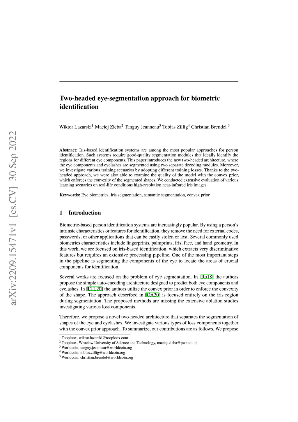 Iris-based identification systems are among the most popular approaches for person identification. Such systems require good-quality segmentation modules that ideally identify the regions for different eye components. This paper introduces the new two-headed architecture, where the eye components and eyelashes are segmented using two separate decoding modules. Moreover, we investigate various training scenarios by adopting different training losses. Thanks to the two-headed approach, we were also able to examine the quality of the model with the convex prior, which enforces the convexity of the segmented shapes. We conducted an extensive evaluation of various learning scenarios on real-life conditions high-resolution near-infrared iris images.