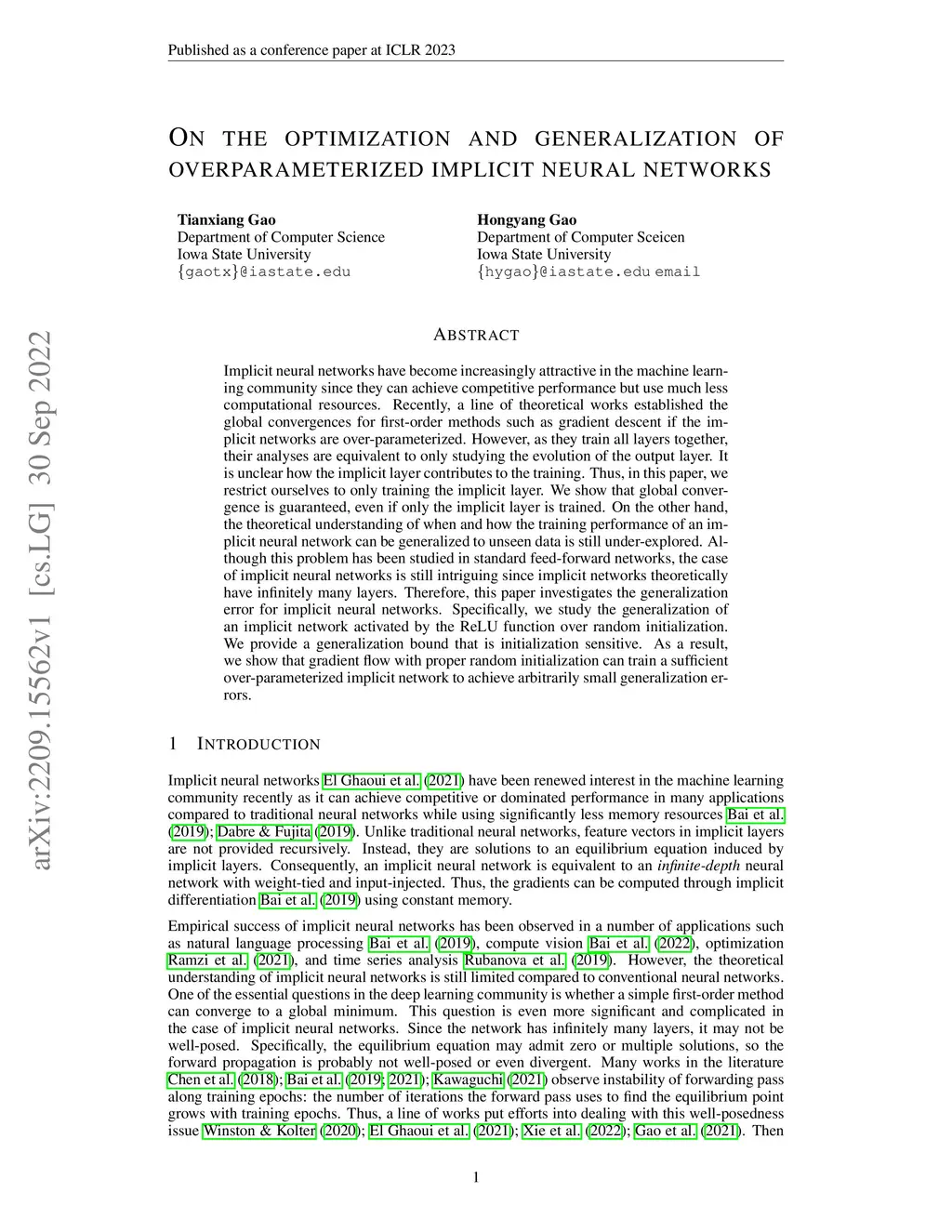 Implicit neural networks have become increasingly attractive in the machine learning community since they can achieve competitive performance but use much less computational resources. Recently, a line of theoretical works established the global convergences for first-order methods such as gradient descent if the implicit networks are over-parameterized. However, as they train all layers together, their analyses are equivalent to only studying the evolution of the output layer. It is unclear how the implicit layer contributes to the training. Thus, in this paper, we restrict ourselves to only training the implicit layer. We show that global convergence is guaranteed, even if only the implicit layer is trained. On the other hand, the theoretical understanding of when and how the training performance of an implicit neural network can be generalized to unseen data is still under-explored. Although this problem has been studied in standard feed-forward networks, the case of implicit neural networks is still intriguing since implicit networks theoretically have infinitely many layers. Therefore, this paper investigates the generalization error for implicit neural networks. Specifically, we study the generalization of an implicit network activated by the ReLU function over random initialization. We provide a generalization bound that is initialization sensitive. As a result, we show that gradient flow with proper random initialization can train a sufficient over-parameterized implicit network to achieve arbitrarily small generalization errors.