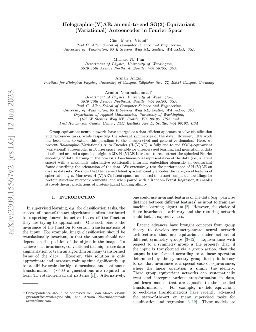 Group-equivariant neural networks have emerged as a data-efficient approach to solve classification and regression tasks, while respecting the relevant symmetries of the data. However, little work has been done to extend this paradigm to the unsupervised and generative domains. Here, we present Holographic-(Variational) Auto Encoder (H-(V)AE), a fully end-to-end SO(3)-equivariant (variational) autoencoder in Fourier space, suitable for unsupervised learning and generation of data distributed around a specified origin in 3D. H-(V)AE is trained to reconstruct the spherical Fourier encoding of data, learning in the process a low-dimensional representation of the data (i.e., a latent space) with a maximally informative rotationally invariant embedding alongside an equivariant frame describing the orientation of the data. We extensively test the performance of H-(V)AE on diverse datasets. We show that the learned latent space efficiently encodes the categorical features of spherical images. Moreover, H-(V)AE's latent space can be used to extract compact embeddings for protein structure microenvironments, and when paired with a Random Forest Regressor, it enables state-of-the-art predictions of protein-ligand binding affinity.