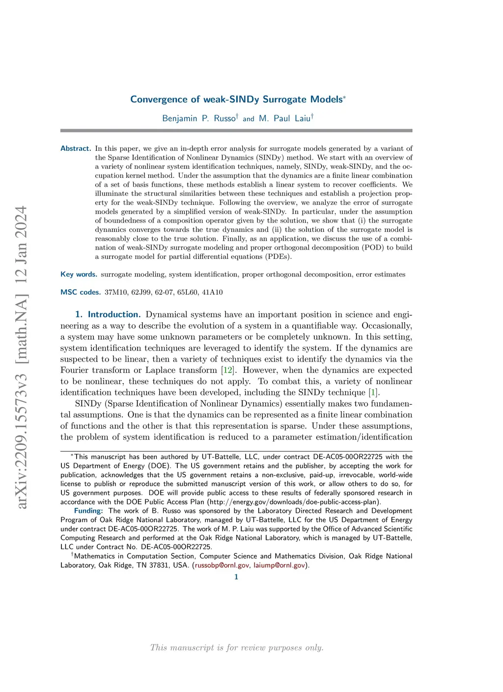 In this paper, we give an in-depth error analysis for surrogate models generated by a variant of the Sparse Identification of Nonlinear Dynamics (SINDy) method. We start with an overview of a variety of non-linear system identification techniques, namely, SINDy, weak-SINDy, and the occupation kernel method. Under the assumption that the dynamics are a finite linear combination of a set of basis functions, these methods establish a matrix equation to recover coefficients. We illuminate the structural similarities between these techniques and establish a projection property for the weak-SINDy technique. Following the overview, we analyze the error of surrogate models generated by a simplified version of weak-SINDy. In particular, under the assumption of boundedness of a composition operator given by the solution, we show that (i) the surrogate dynamics converges towards the true dynamics and (ii) the solution of the surrogate model is reasonably close to the true solution. Finally, as an application, we discuss the use of a combination of weak-SINDy surrogate modeling and proper orthogonal decomposition (POD) to build a surrogate model for partial differential equations (PDEs).