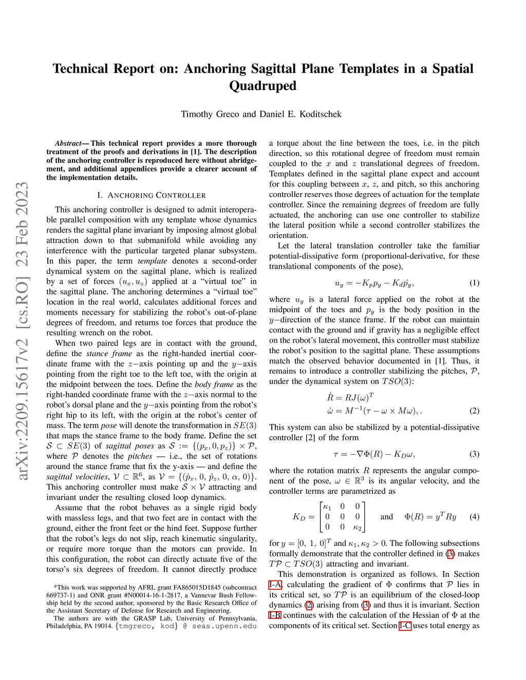 This technical report provides a more thorough treatment of the proofs and derivations contained in a recent conference paper submission. The description of the anchoring controller is reproduced here without abridgement, and additional appendices provide a clearer account of the implementation details.