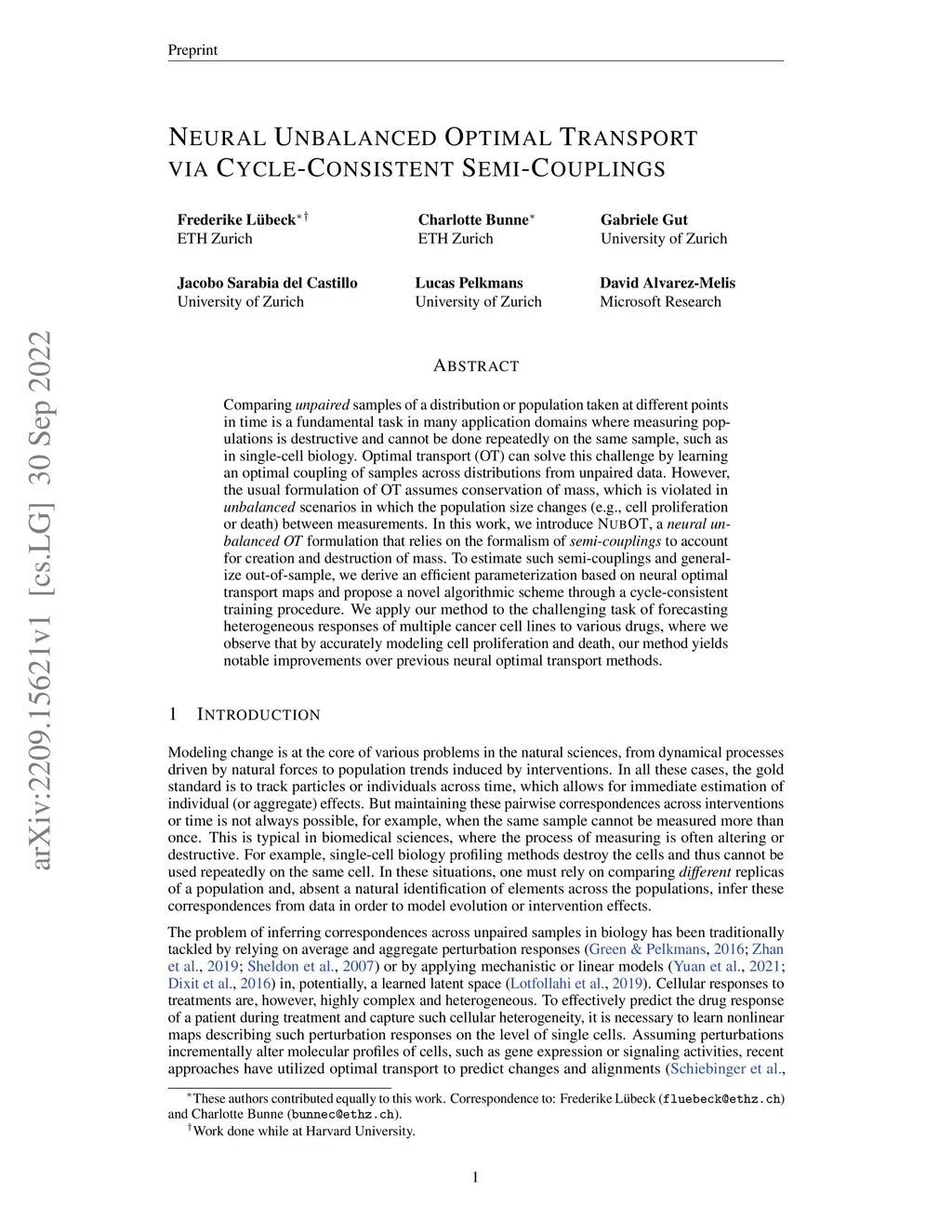 Comparing unpaired samples of a distribution or population taken at different points in time is a fundamental task in many application domains where measuring populations is destructive and cannot be done repeatedly on the same sample, such as in single-cell biology. Optimal transport (OT) can solve this challenge by learning an optimal coupling of samples across distributions from unpaired data. However, the usual formulation of OT assumes conservation of mass, which is violated in unbalanced scenarios in which the population size changes (e.g., cell proliferation or death) between measurements. In this work, we introduce NubOT, a neural unbalanced OT formulation that relies on the formalism of semi-couplings to account for creation and destruction of mass. To estimate such semi-couplings and generalize out-of-sample, we derive an efficient parameterization based on neural optimal transport maps and propose a novel algorithmic scheme through a cycle-consistent training procedure. We apply our method to the challenging task of forecasting heterogeneous responses of multiple cancer cell lines to various drugs, where we observe that by accurately modeling cell proliferation and death, our method yields notable improvements over previous neural optimal transport methods.