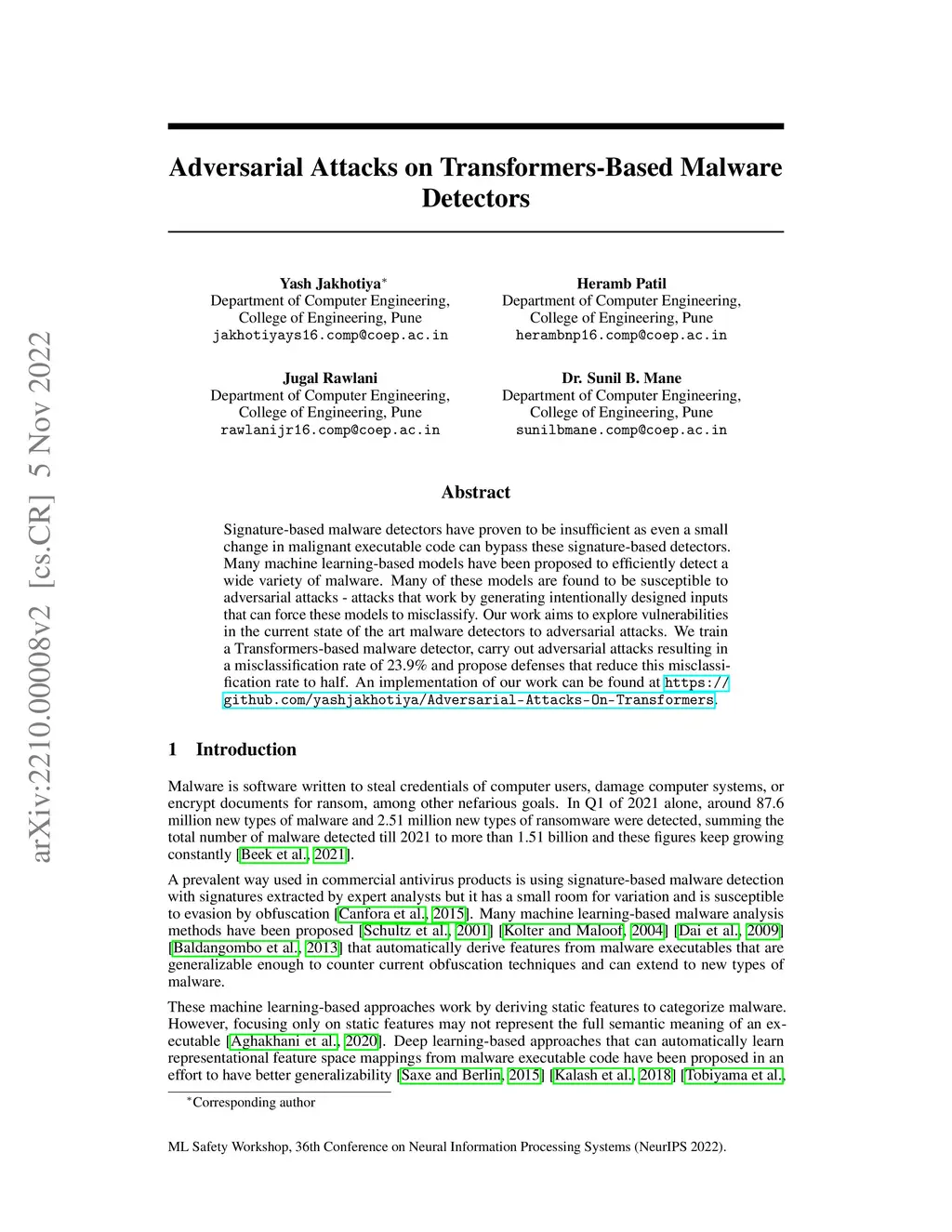 Signature-based malware detectors have proven to be insufficient as even a small change in malignant executable code can bypass these signature-based detectors. Many machine learning-based models have been proposed to efficiently detect a wide variety of malware. Many of these models are found to be susceptible to adversarial attacks - attacks that work by generating intentionally designed inputs that can force these models to misclassify. Our work aims to explore vulnerabilities in the current state of the art malware detectors to adversarial attacks. We train a Transformers-based malware detector, carry out adversarial attacks resulting in a misclassification rate of 23.9% and propose defenses that reduce this misclassification rate to half. An implementation of our work can be found at https://github.com/yashjakhotiya/Adversarial-Attacks-On-Transformers.