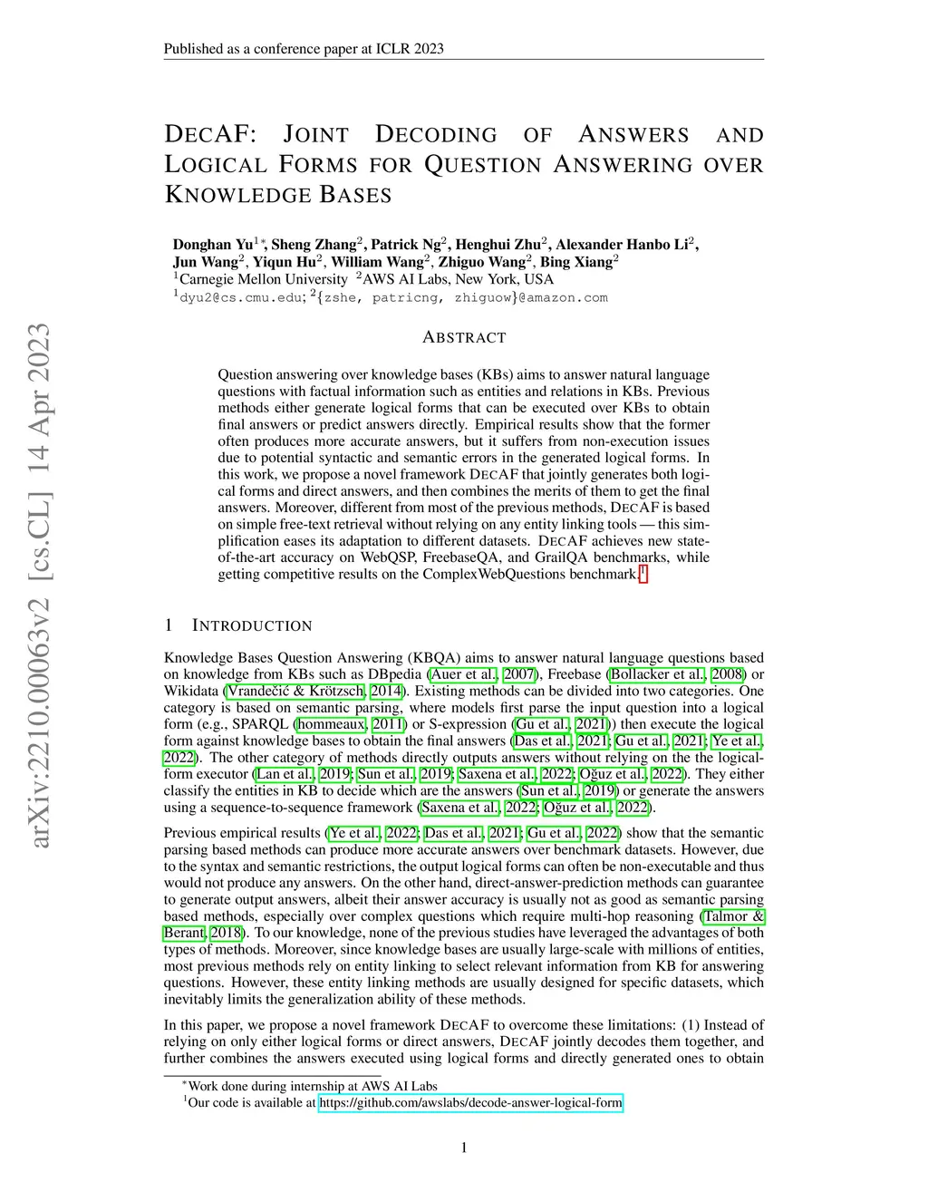 DecAF: Joint Decoding of Answers and Logical Forms for Question