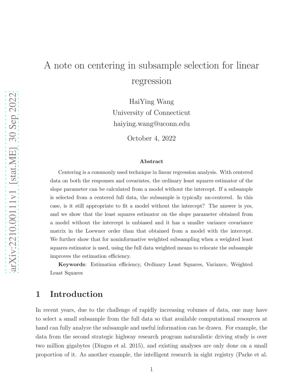 Centering is a commonly used technique in linear regression analysis. With centered data on both the responses and covariates, the ordinary least squares estimator of the slope parameter can be calculated from a model without the intercept. If a subsample is selected from a centered full data, the subsample is typically un-centered. In this case, is it still appropriate to fit a model without the intercept? The answer is yes, and we show that the least squares estimator on the slope parameter obtained from a model without the intercept is unbiased and it has a smaller variance covariance matrix in the Loewner order than that obtained from a model with the intercept. We further show that for noninformative weighted subsampling when a weighted least squares estimator is used, using the full data weighted means to relocate the subsample improves the estimation efficiency.