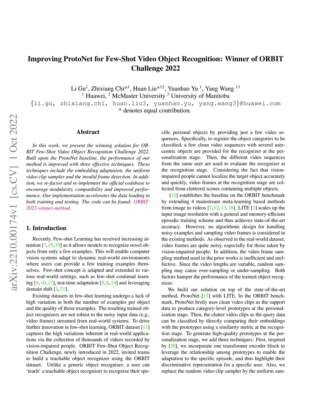 In this work, we present the winning solution for ORBIT Few-Shot Video Object Recognition Challenge 2022. Built upon the ProtoNet baseline, the performance of our method is improved with three effective techniques. These techniques include the embedding adaptation, the uniform video clip sampler and the invalid frame detection. In addition, we re-factor and re-implement the official codebase to encourage modularity, compatibility and improved performance. Our implementation accelerates the data loading in both training and testing.