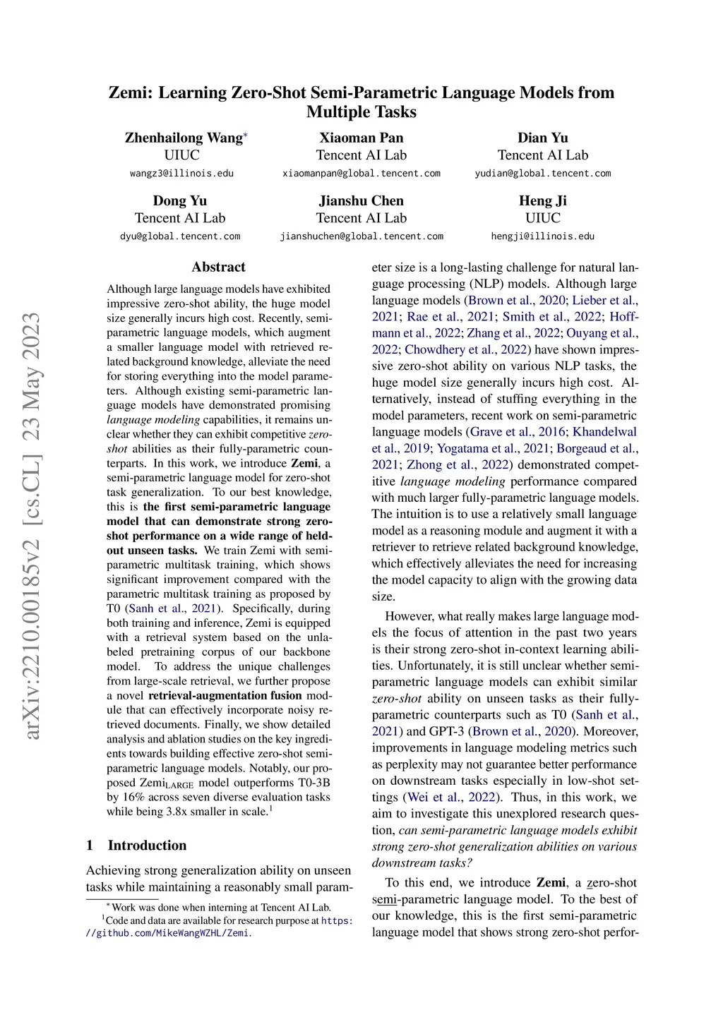 Although large language models have achieved impressive zero-shot ability, the huge model size generally incurs high cost. Recently, semi-parametric language models, which augment a smaller language model with an external retriever, have demonstrated promising language modeling capabilities. However, it remains unclear whether such semi-parametric language models can perform competitively well as their fully-parametric counterparts on zero-shot generalization to downstream tasks. In this work, we introduce , a zero-shot semi-parametric language model. To our best knowledge, this is the first semi-parametric language model that can demonstrate strong zero-shot performance on a wide range of held-out unseen tasks. We train with a novel semi-parametric multitask prompted training paradigm, which shows significant improvement compared with the parametric multitask training as proposed by T0. Specifically, we augment the multitask training and zero-shot evaluation with retrieval from a large-scale task-agnostic unlabeled corpus. In order to incorporate multiple potentially noisy retrieved augmentations, we further propose a novel module leveraging perceiver resampler and gated cross-attention. Notably, our proposed outperforms T0-3B by 16% on all seven evaluation tasks while being 3.9x smaller in model size.