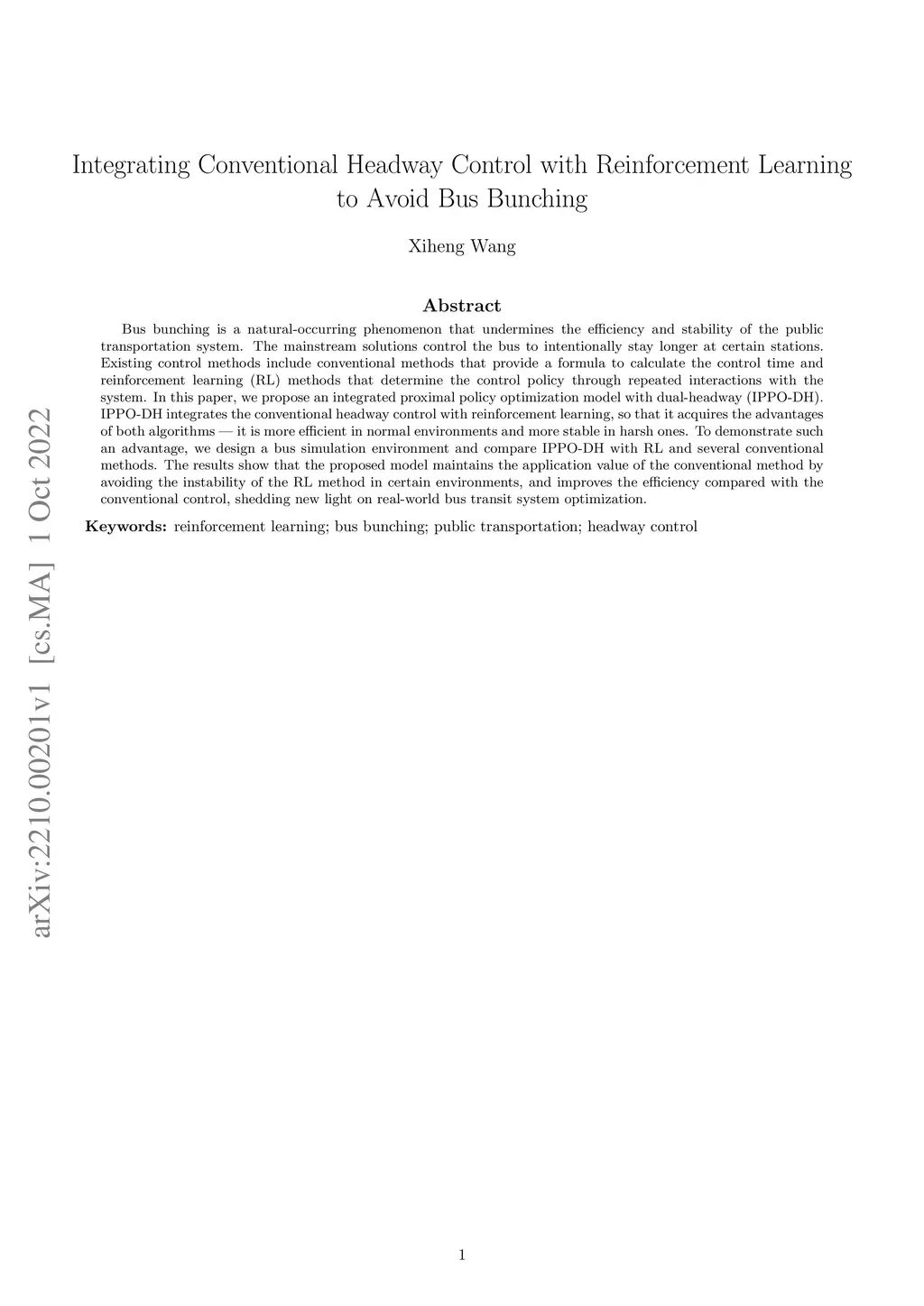 Bus bunching is a natural-occurring phenomenon that undermines the efficiency and stability of the public transportation system. The mainstream solutions control the bus to intentionally stay longer at certain stations. Existing control methods include conventional methods that provide a formula to calculate the control time and reinforcement learning (RL) methods that determine the control policy through repeated interactions with the system. In this paper, we propose an integrated proximal policy optimization model with dual-headway (IPPO-DH). IPPO-DH integrates the conventional headway control with reinforcement learning, so that it acquires the advantages of both algorithms -- it is more efficient in normal environments and more stable in harsh ones. To demonstrate such an advantage, we design a bus simulation environment and compare IPPO-DH with RL and several conventional methods. The results show that the proposed model maintains the application value of the conventional method by avoiding the instability of the RL method in certain environments, and improves the efficiency compared with the conventional control, shedding new light on real-world bus transit system optimization.