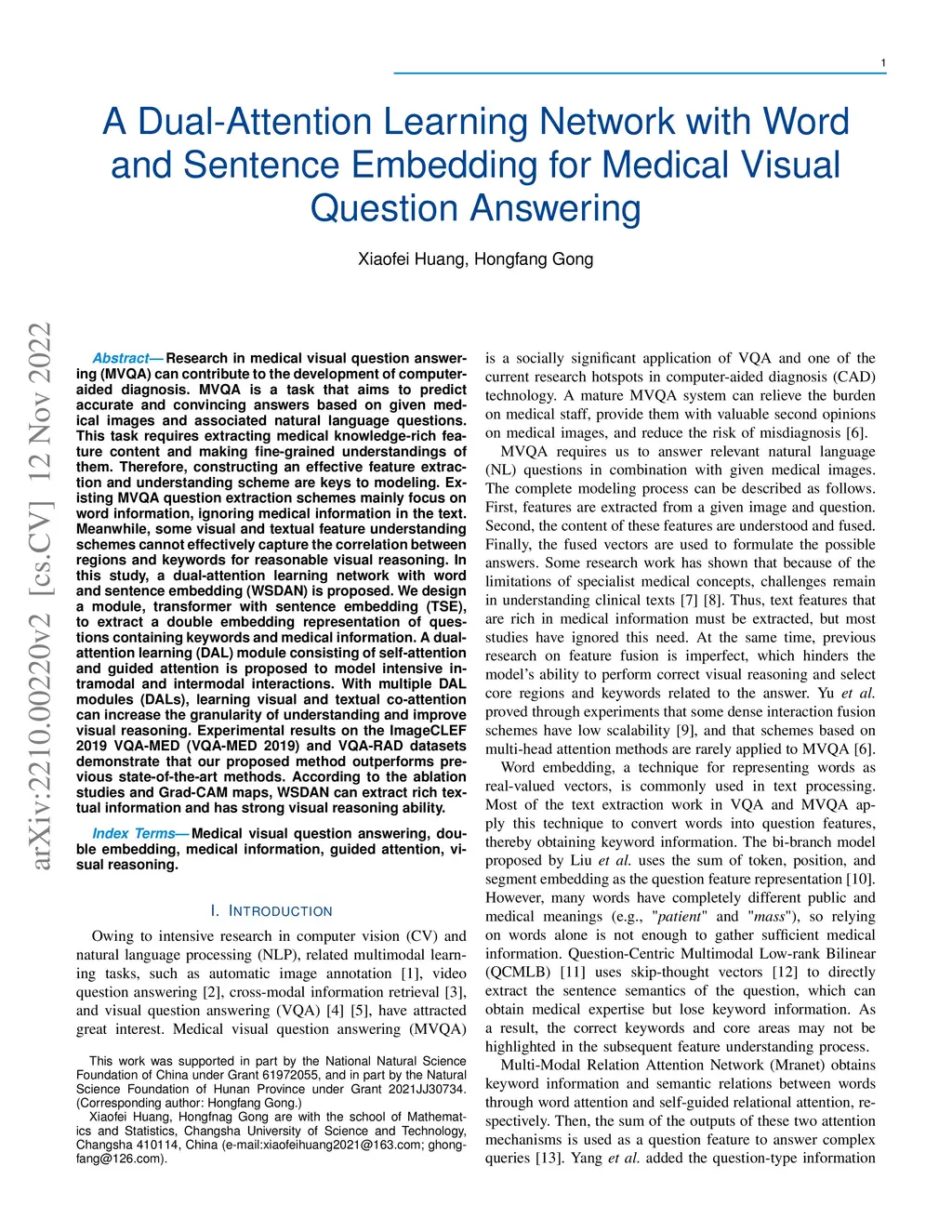 Research in medical visual question answering (MVQA) can contribute to the development of computeraided diagnosis. MVQA is a task that aims to predict accurate and convincing answers based on given medical images and associated natural language questions. This task requires extracting medical knowledge-rich feature content and making fine-grained understandings of them. Therefore, constructing an effective feature extraction and understanding scheme are keys to modeling. Existing MVQA question extraction schemes mainly focus on word information, ignoring medical information in the text. Meanwhile, some visual and textual feature understanding schemes cannot effectively capture the correlation between regions and keywords for reasonable visual reasoning. In this study, a dual-attention learning network with word and sentence embedding (WSDAN) is proposed. We design a module, transformer with sentence embedding (TSE), to extract a double embedding representation of questions containing keywords and medical information. A dualattention learning (DAL) module consisting of self-attention and guided attention is proposed to model intensive intramodal and intermodal interactions. With multiple DAL modules (DALs), learning visual and textual co-attention can increase the granularity of understanding and improve visual reasoning. Experimental results on the ImageCLEF 2019 VQA-MED (VQA-MED 2019) and VQA-RAD datasets demonstrate that our proposed method outperforms previous state-of-the-art methods. According to the ablation studies and Grad-CAM maps, WSDAN can extract rich textual information and has strong visual reasoning ability.