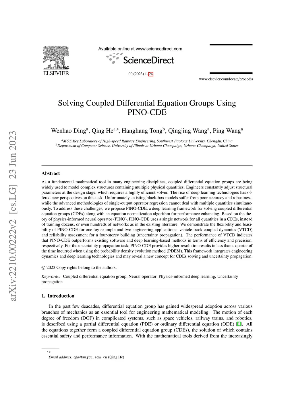 As a fundamental mathmatical tool in many engineering disciplines, coupled differential equation groups are being widely used to model complex structures containing multiple physical quantities. Engineers constantly adjust structural parameters at the design stage, which requires a highly efficient solver. The rise of deep learning technologies has offered new perspectives on this task. Unfortunately, existing black-box models suffer from poor accuracy and robustness, while the advanced methodologies of single-output operator regression cannot deal with multiple quantities simultaneously. To address these challenges, we propose PINO-CDE, a deep learning framework for solving coupled differential equation groups (CDEs) along with an equation normalization algorithm for performance enhancing. Based on the theory of physics-informed neural operator (PINO), PINO-CDE uses a single network for all quantities in a CDEs, instead of training dozens, or even hundreds of networks as in the existing literature. We demonstrate the flexibility and feasibility of PINO-CDE for one toy example and two engineering applications: vehicle-track coupled dynamics (VTCD) and reliability assessment for a four-storey building (uncertainty propagation). The performance of VTCD indicates that PINO-CDE outperforms existing software and deep learning-based methods in terms of efficiency and precision, respectively. For the uncertainty propagation task, PINO-CDE provides higher-resolution results in less than a quarter of the time incurred when using the probability density evolution method (PDEM). This framework integrates engineering dynamics and deep learning technologies and may reveal a new concept for CDEs solving and uncertainty propagation.