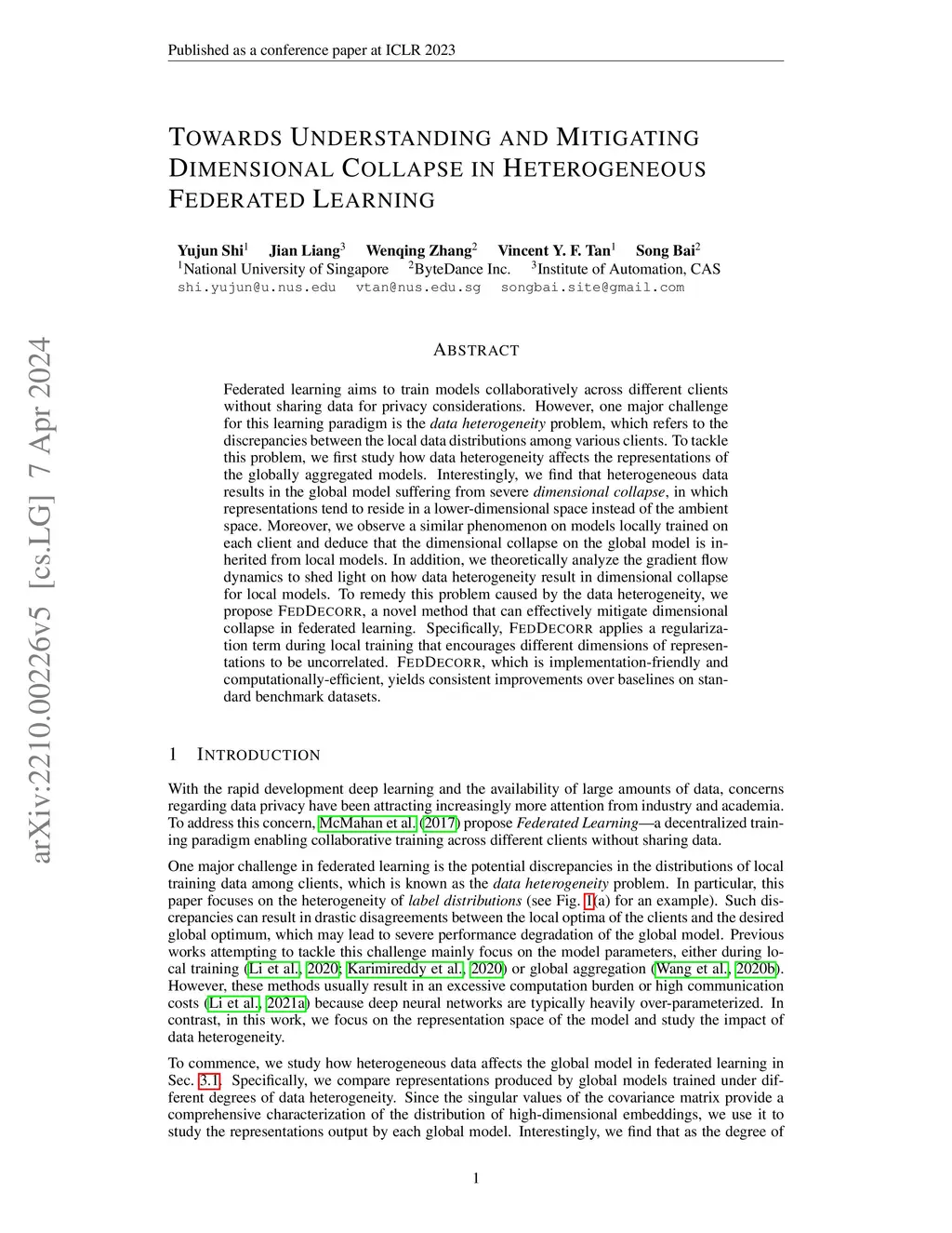 Federated learning aims to train models collaboratively across different clients without the sharing of data for privacy considerations. However, one major challenge for this learning paradigm is the {\em data heterogeneity} problem, which refers to the discrepancies between the local data distributions among various clients. To tackle this problem, we first study how data heterogeneity affects the representations of the globally aggregated models. Interestingly, we find that heterogeneous data results in the global model suffering from severe {\em dimensional collapse}, in which representations tend to reside in a lower-dimensional space instead of the ambient space. Moreover, we observe a similar phenomenon on models locally trained on each client and deduce that the dimensional collapse on the global model is inherited from local models. In addition, we theoretically analyze the gradient flow dynamics to shed light on how data heterogeneity result in dimensional collapse for local models. To remedy this problem caused by the data heterogeneity, we propose {\sc FedDecorr}, a novel method that can effectively mitigate dimensional collapse in federated learning. Specifically, {\sc FedDecorr} applies a regularization term during local training that encourages different dimensions of representations to be uncorrelated. {\sc FedDecorr}, which is implementation-friendly and computationally-efficient, yields consistent improvements over baselines on standard benchmark datasets. Code: https://github.com/bytedance/FedDecorr.