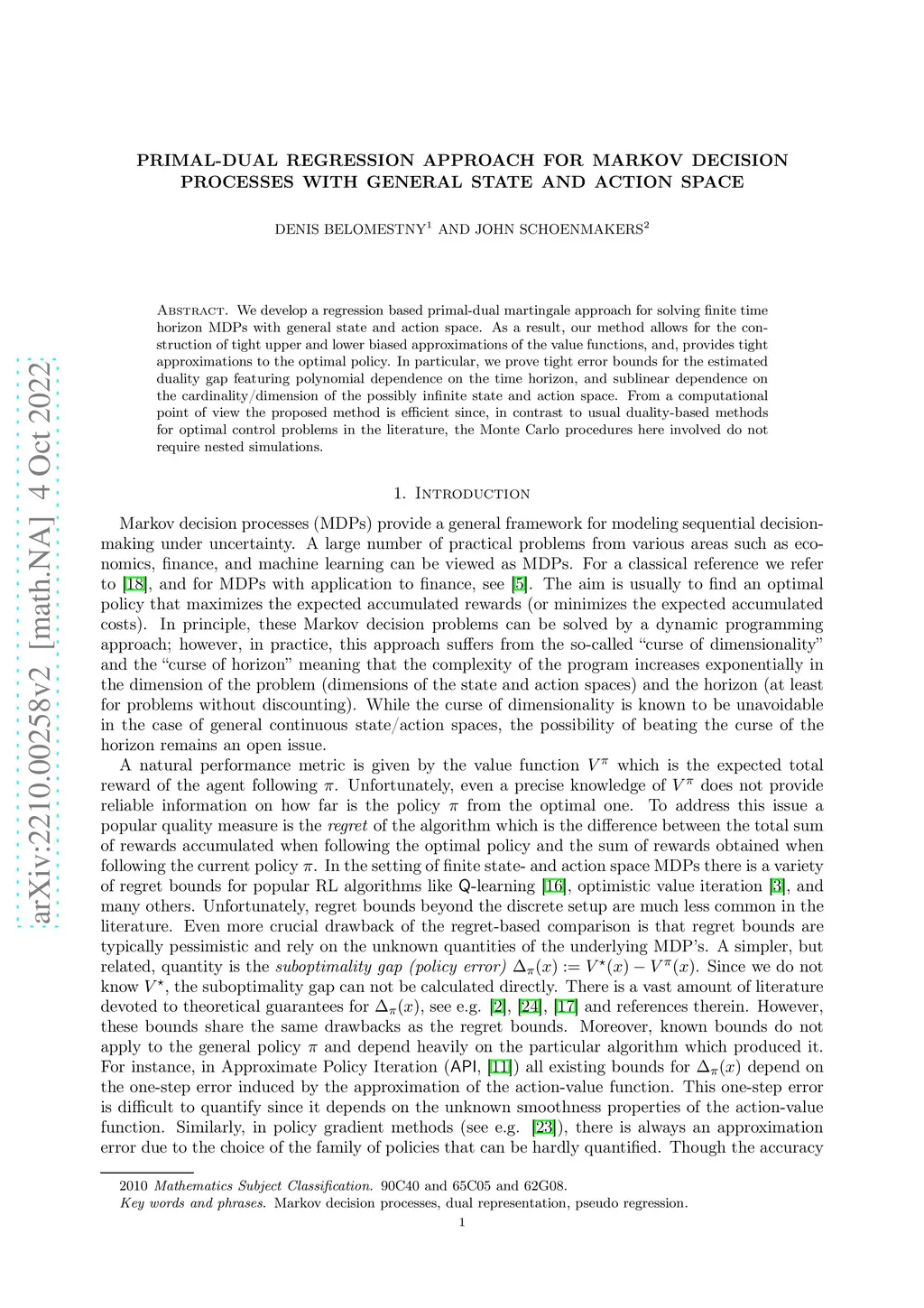 We develop a regression based primal-dual martingale approach for solving finite time horizon MDPs with general state and action space. As a result, our method allows for the construction of tight upper and lower biased approximations of the value functions, and, provides tight approximations to the optimal policy. In particular, we prove tight error bounds for the estimated duality gap featuring polynomial dependence on the time horizon, and sublinear dependence on the cardinality/dimension of the possibly infinite state and action space.From a computational point of view the proposed method is efficient since, in contrast to usual duality-based methods for optimal control problems in the literature, the Monte Carlo procedures here involved do not require nested simulations.