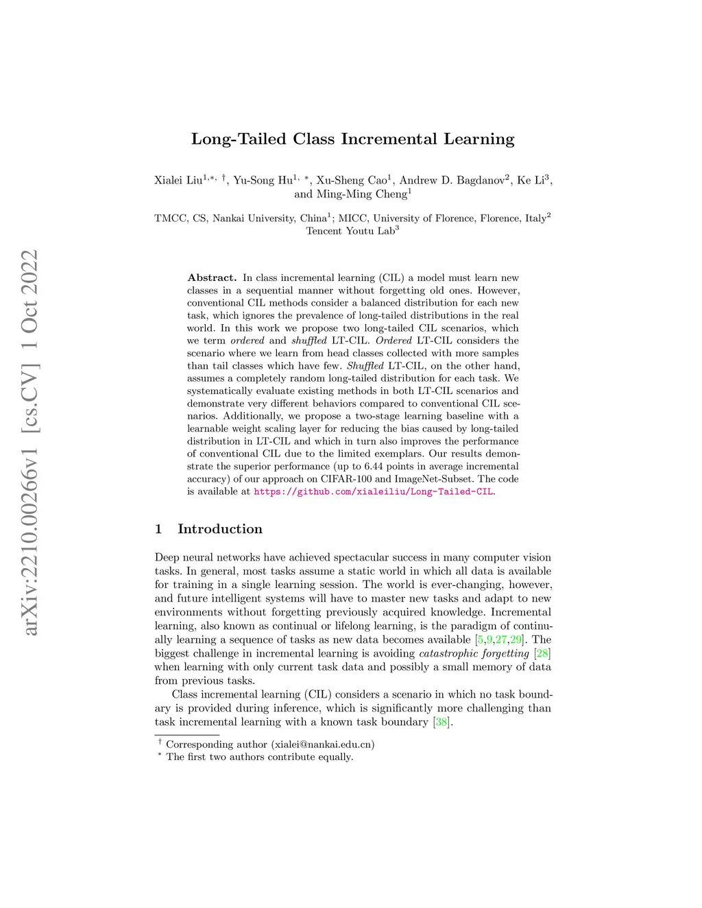 In class incremental learning (CIL) a model must learn new classes in a sequential manner without forgetting old ones. However, conventional CIL methods consider a balanced distribution for each new task, which ignores the prevalence of long-tailed distributions in the real world. In this work we propose two long-tailed CIL scenarios, which we term ordered and shuffled LT-CIL. Ordered LT-CIL considers the scenario where we learn from head classes collected with more samples than tail classes which have few. Shuffled LT-CIL, on the other hand, assumes a completely random long-tailed distribution for each task. We systematically evaluate existing methods in both LT-CIL scenarios and demonstrate very different behaviors compared to conventional CIL scenarios. Additionally, we propose a two-stage learning baseline with a learnable weight scaling layer for reducing the bias caused by long-tailed distribution in LT-CIL and which in turn also improves the performance of conventional CIL due to the limited exemplars. Our results demonstrate the superior performance (up to 6.44 points in average incremental accuracy) of our approach on CIFAR-100 and ImageNet-Subset. The code is available at https://github.com/xialeiliu/Long-Tailed-CIL