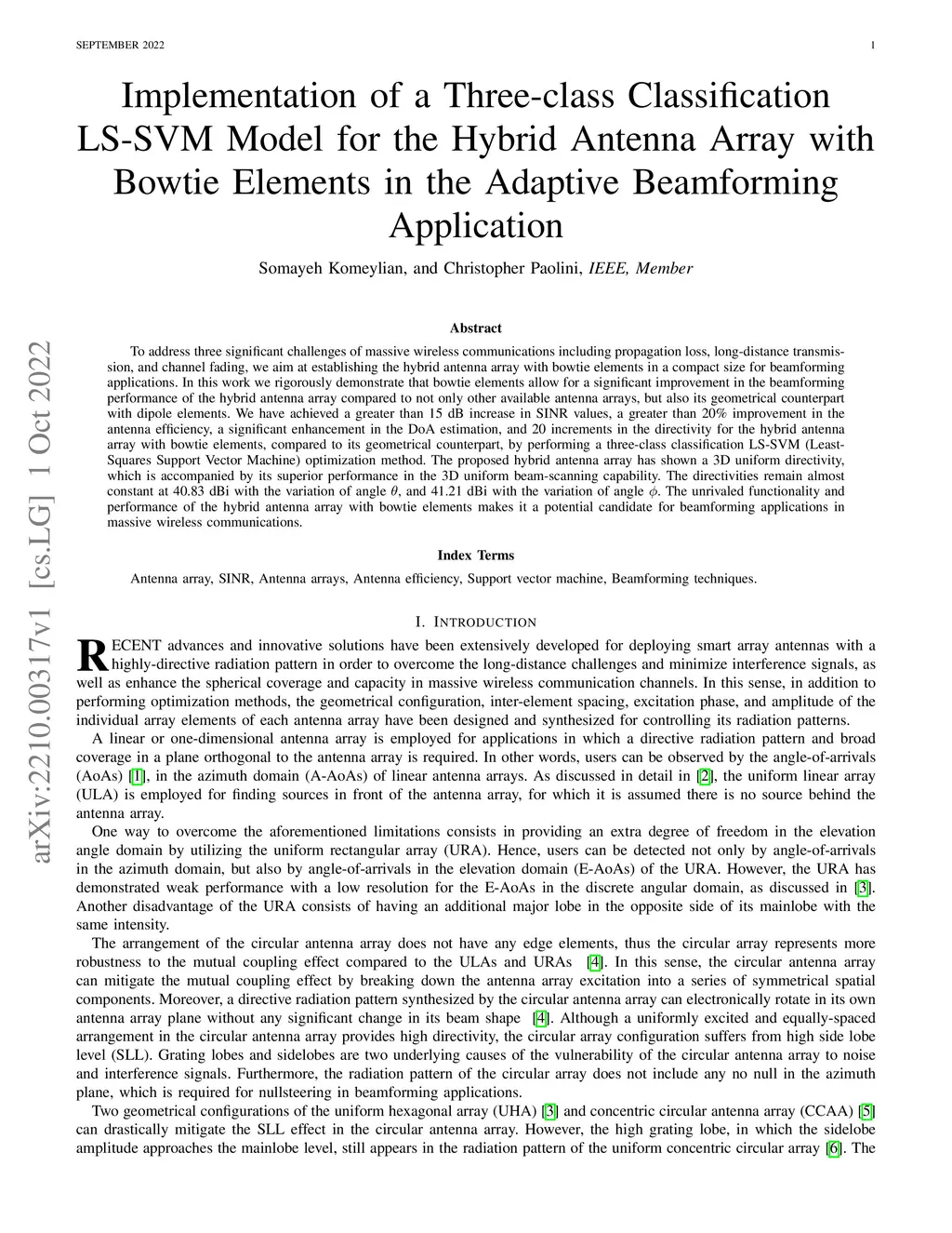 To address three significant challenges of massive wireless communications including propagation loss, long-distance transmission, and channel fading, we aim at establishing the hybrid antenna array with bowtie elements in a compact size for beamforming applications. In this work we rigorously demonstrate that bowtie elements allow for a significant improvement in the beamforming performance of the hybrid antenna array compared to not only other available antenna arrays, but also its geometrical counterpart with dipole elements. We have achieved a greater than 15 dB increase in SINR values, a greater than 20% improvement in the antenna efficiency, a significant enhancement in the DoA estimation, and 20 increments in the directivity for the hybrid antenna array with bowtie elements, compared to its geometrical counterpart, by performing a three-class classification LS-SVM (LeastSquares Support Vector Machine) optimization method. The proposed hybrid antenna array has shown a 3D uniform directivity, which is accompanied by its superior performance in the 3D uniform beam-scanning capability. The directivities remain almost constant at 40.83 dBi with the variation of angle {\theta}, and 41.21 dBi with the variation of angle {\phi}. The unrivaled functionality and performance of the hybrid antenna array with bowtie elements makes it a potential candidate for beamforming applications in massive wireless communications.